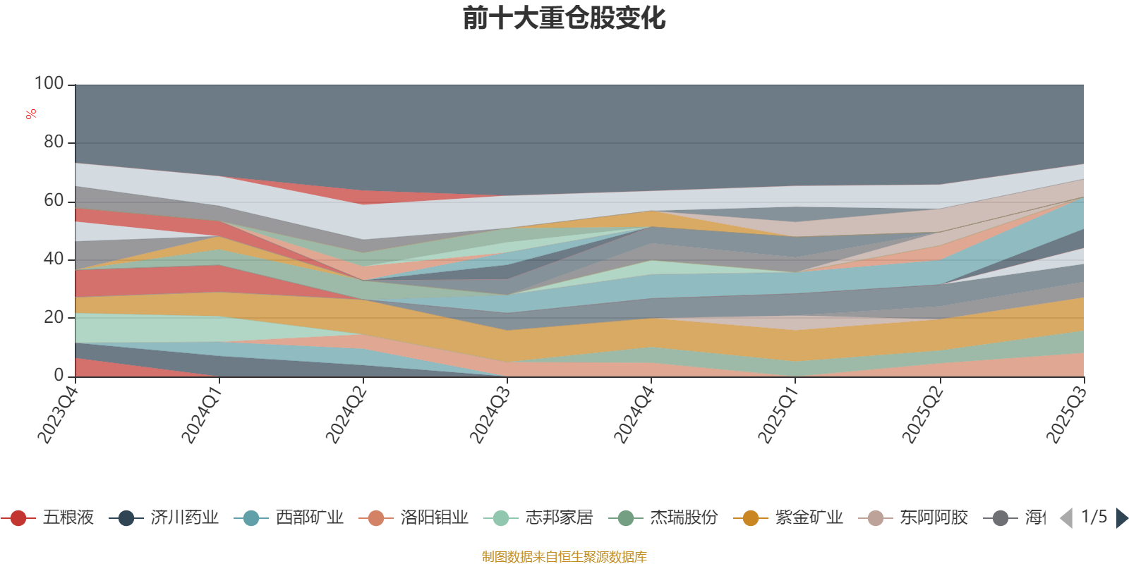 该基金持股集中度较高,近2年前十大重仓股集中度长期超过60%。截至2025年三季度末,基金十大重仓股分别是紫金矿业、宁德时代、洛阳钼业、杰瑞股份、宇通客车、中孚实业、美的集团、海大集团、海信视像、羚锐制药。