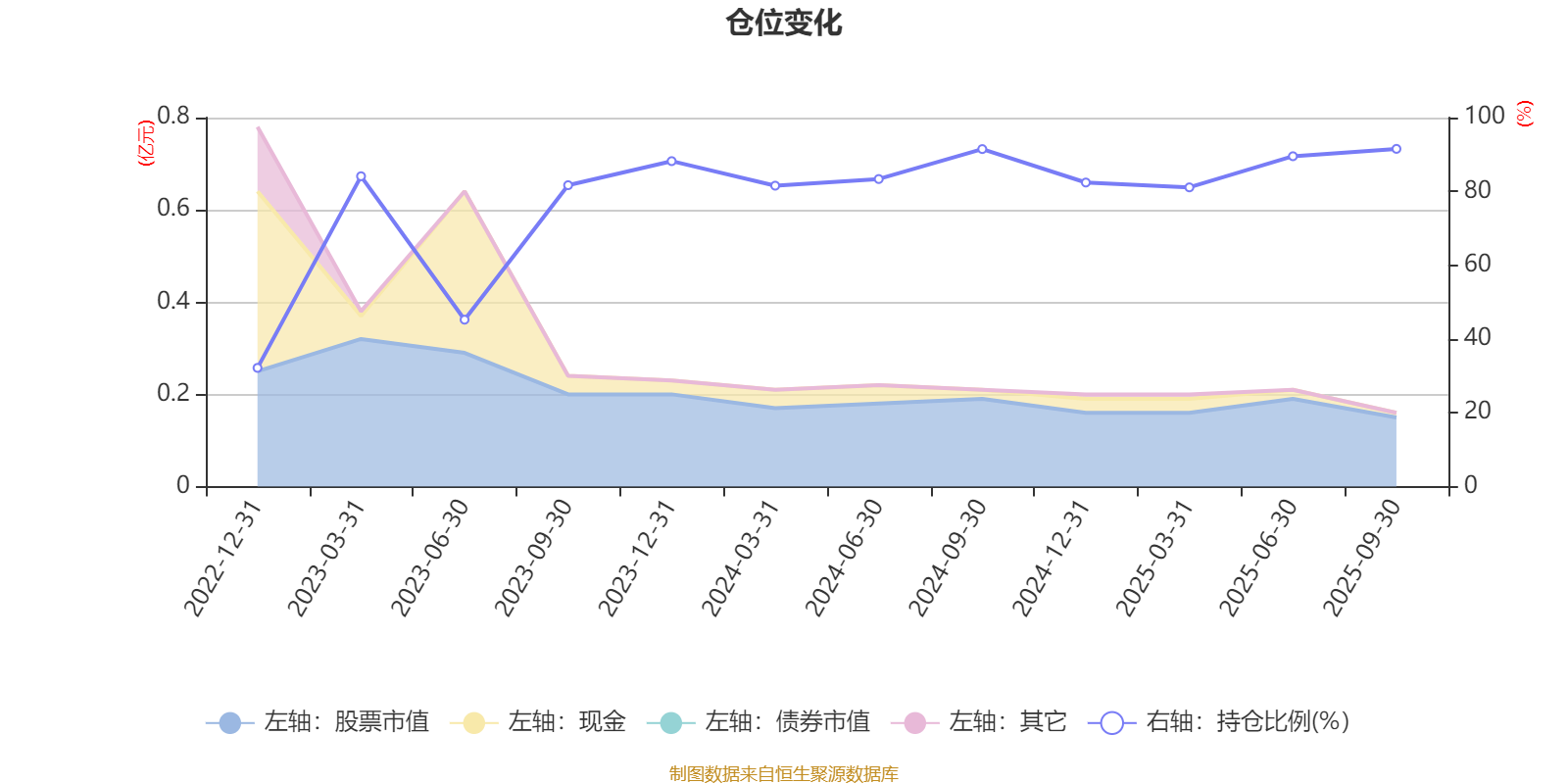 据定期报告数据统计,近三年平均股票仓位为77.69%,同类平均为88.23%。2025年三季度末基金达到91.53%的最高仓位,2022年末最低,为32.17%。