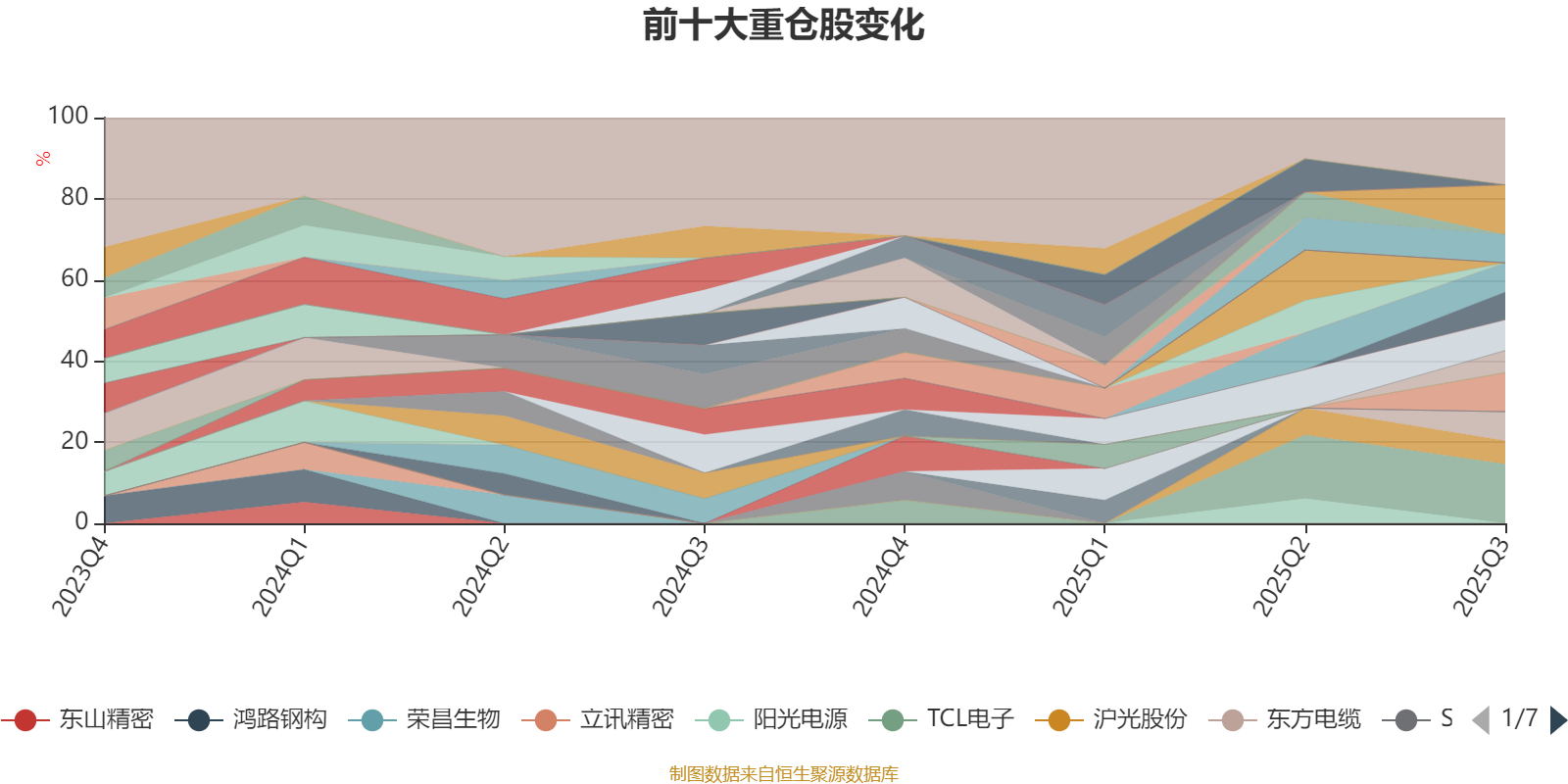 该基金持股集中度较高,近2年前十大重仓股集中度长期超过60%。截至2025年三季度末,基金十大重仓股分别是TCL电子、理想汽车-W、中航机载、广日股份、花园生物、东方电缆、赛力斯、紫光国微、沪光股份、极兔速递-W。