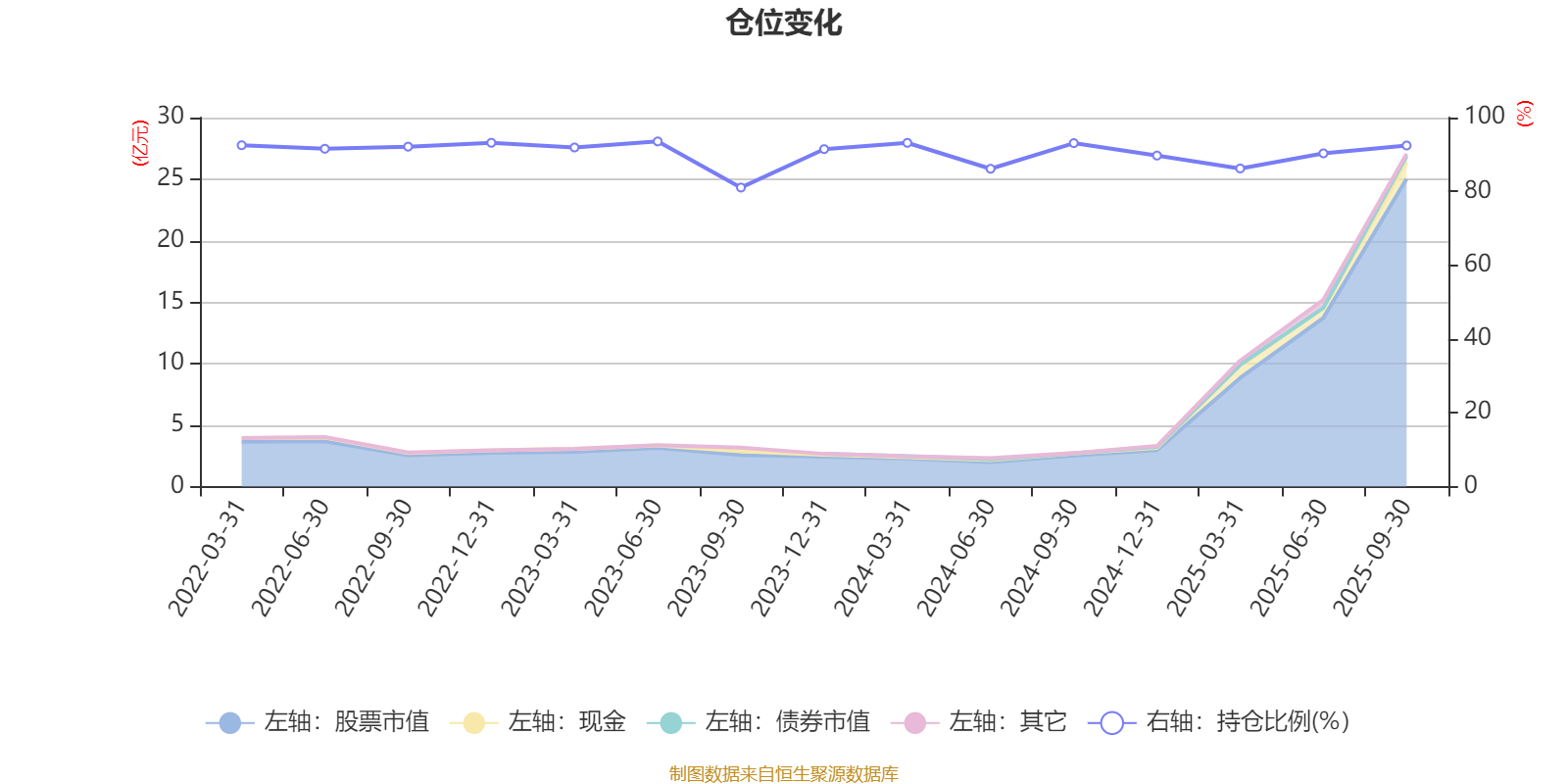 据定期报告数据统计,近三年平均股票仓位为90.18%,同类平均为88.27%。2023年上半年末基金达到93.54%的最高仓位,2023年三季度末最低,为81.04%。