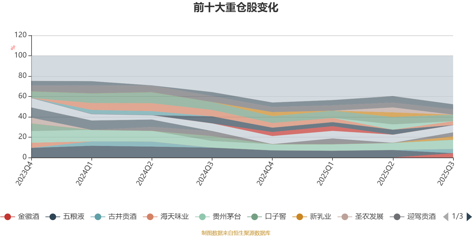 该基金持股集中度较高。截至2025年三季度末,基金十大重仓股分别是贵州茅台、伊利股份、山西汾酒、今世缘、青岛啤酒股份、金徽酒、古井贡酒、迎驾贡酒、东鹏饮料、新乳业。