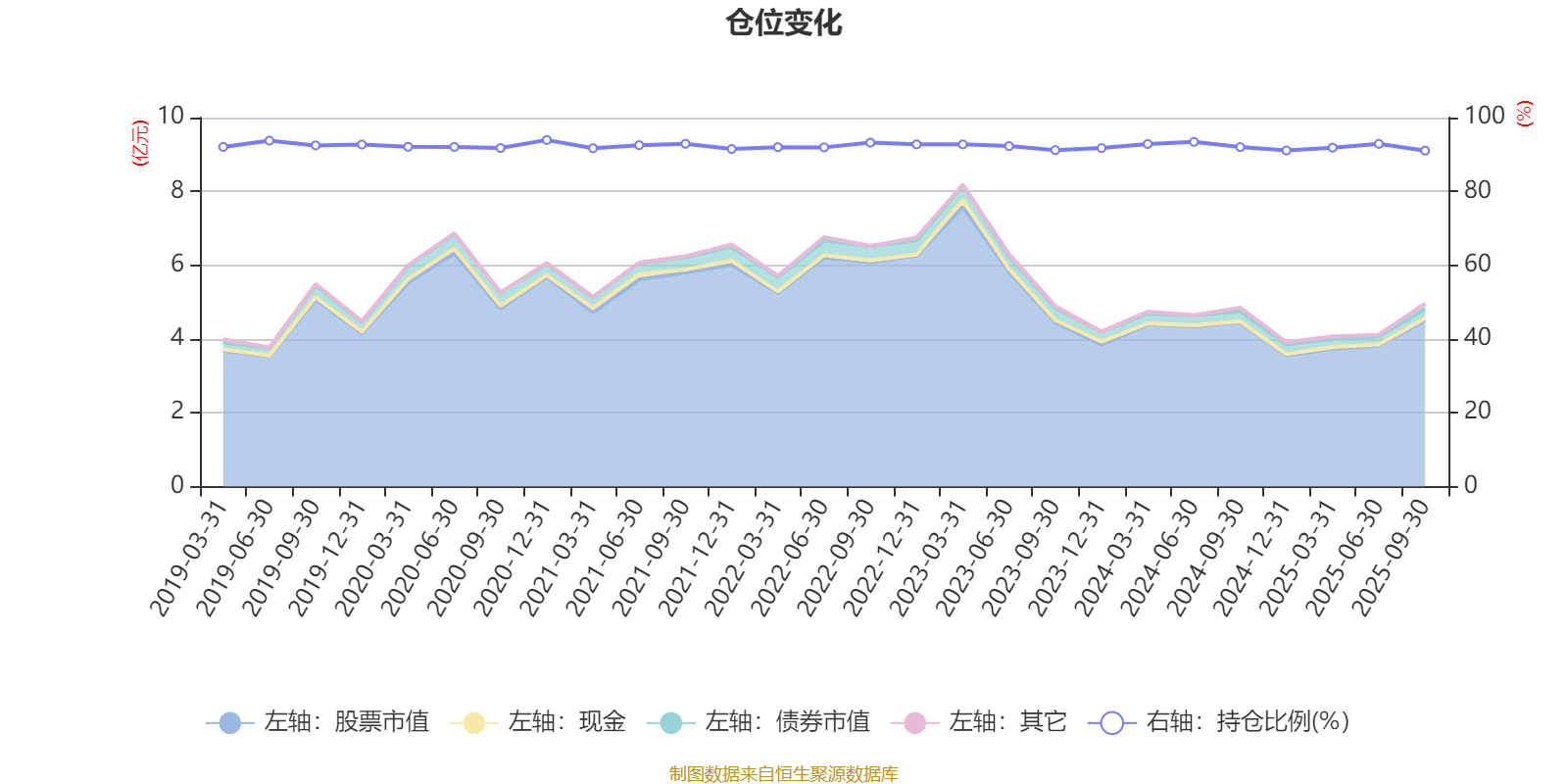 据定期报告数据统计,基金股票仓位长期保持较高水平,近三年平均股票仓位为92.16%,同类平均为88.27%。2020年末基金达到93.92%的最高仓位,2025年三季度末最低,为91.06%。