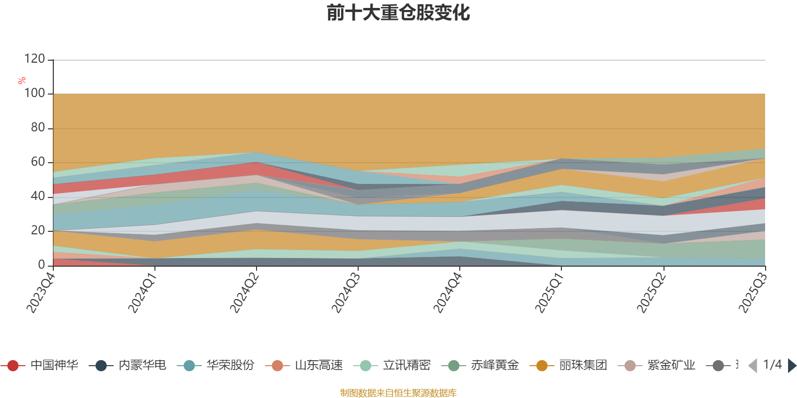 该基金持股集中度较高。截至2025年三季度末,基金十大重仓股分别是山金国际、赤峰黄金、中金黄金、宏发股份、开立医疗、惠泰医疗、湖南黄金、紫金矿业、新奥股份、华荣股份。