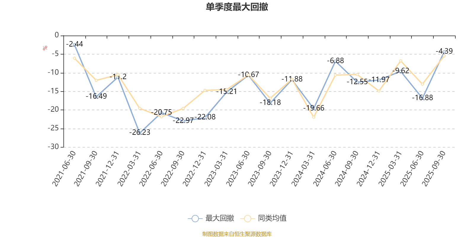 截至10月27日,基金近三年最大回撤为41.4%,同类可比基金排名6/29。单季度最大回撤出现在2022年一季度,为26.23%。