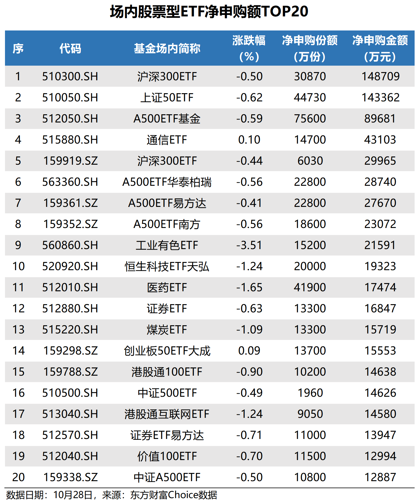 昨日(10月28日),东方财富Choice数据显示,场内股票型ETF净赎回14.51亿份;其中,沪市股票型ETF净申购0.22亿份,深市股票型ETF净赎回14.73亿份。以最新净值计,昨日市场净申购3.96亿元。