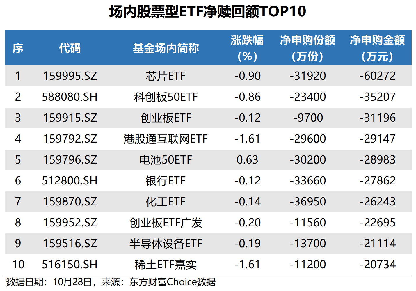 数据还显示,昨日净赎回金额最多的场内股票型ETF为芯片ETF,净赎回金额6.03亿元;科创板50ETF紧随其后,净赎回金额3.52亿元。