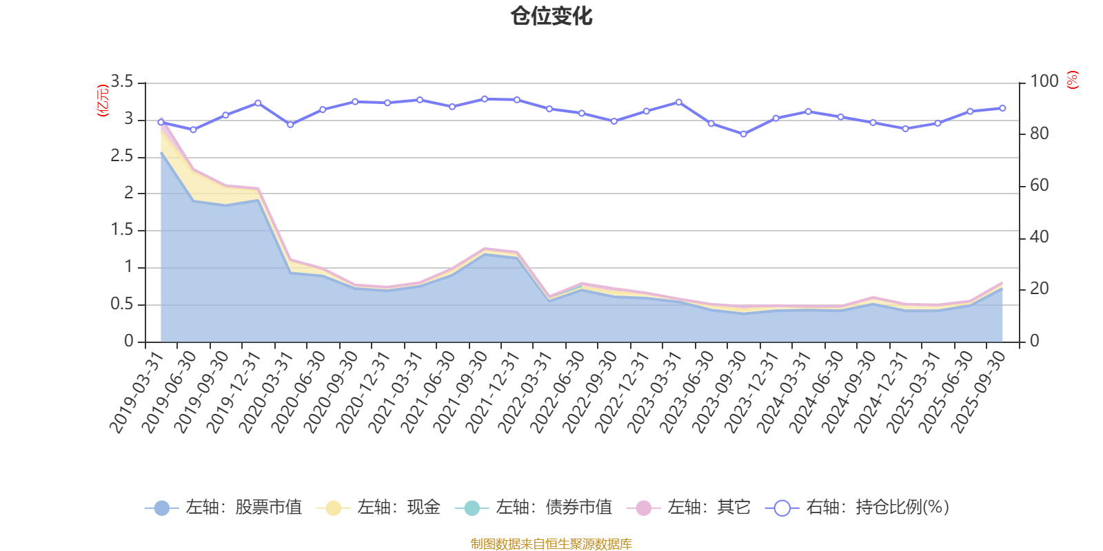 据定期报告数据统计,近三年平均股票仓位为86.51%,同类平均为88.23%。2021年三季度末基金达到93.71%的最高仓位,2023年三季度末最低,为80.19%。