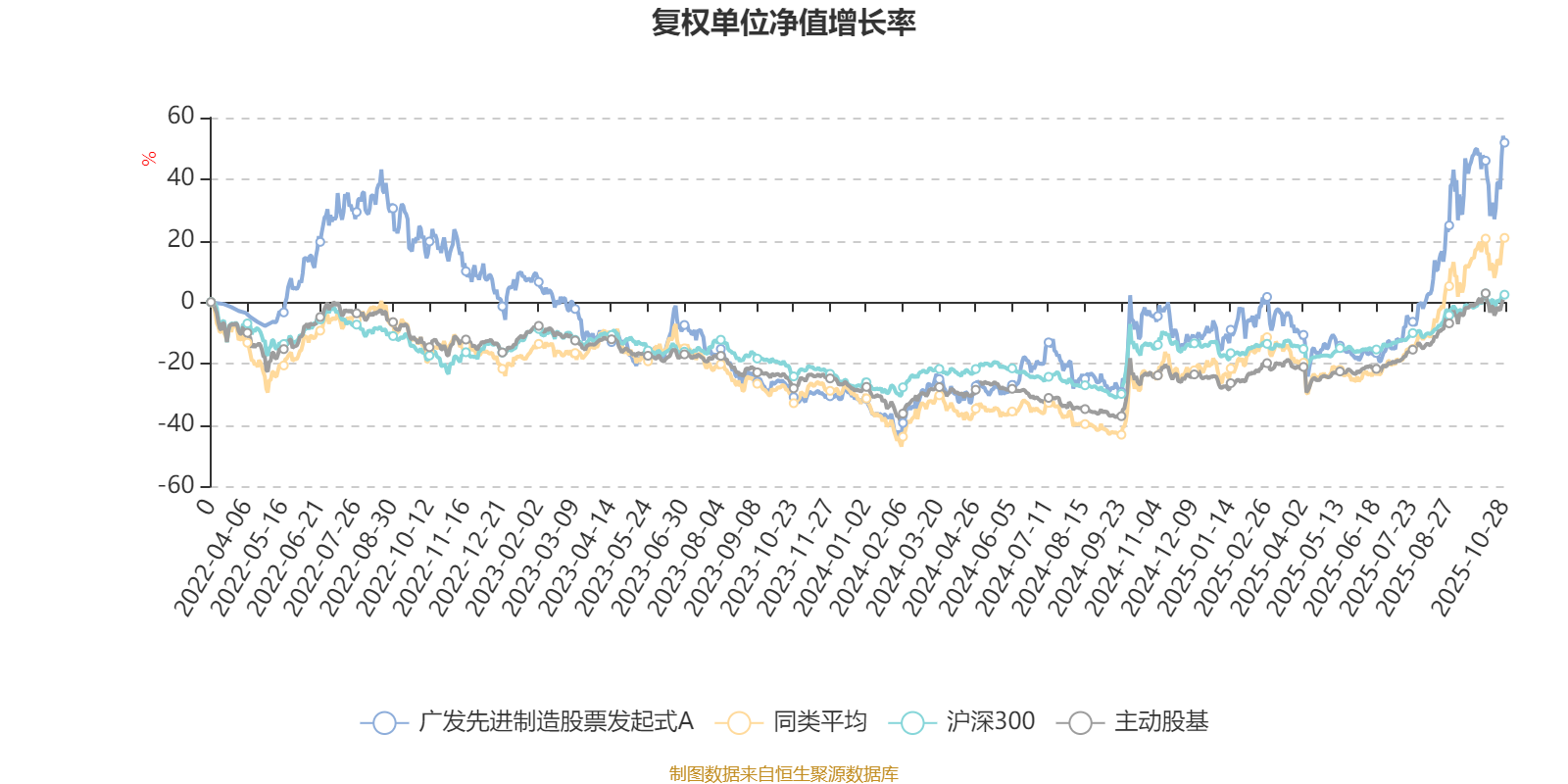 截至10月28日,广发先进制造股票发起式A近三个月复权单位净值增长率为60.16%,位于同类可比基金6/63;近半年复权单位净值增长率为78.19%,位于同类可比基金16/63;近一年复权单位净值增长率为58.77%,位于同类可比基金30/61;近三年复权单位净值增长率为31.80%,位于同类可比基金38/51。