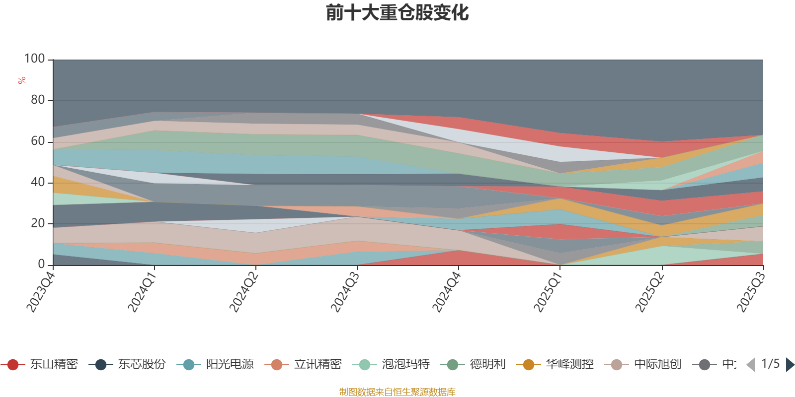 该基金持股集中度较高,近2年前十大重仓股集中度长期超过60%。截至2025年三季度末,基金十大重仓股分别是新易盛、中际旭创、天孚通信、胜宏科技、德明利、浙江荣泰、华虹半导体、中芯国际、源杰科技、东山精密。