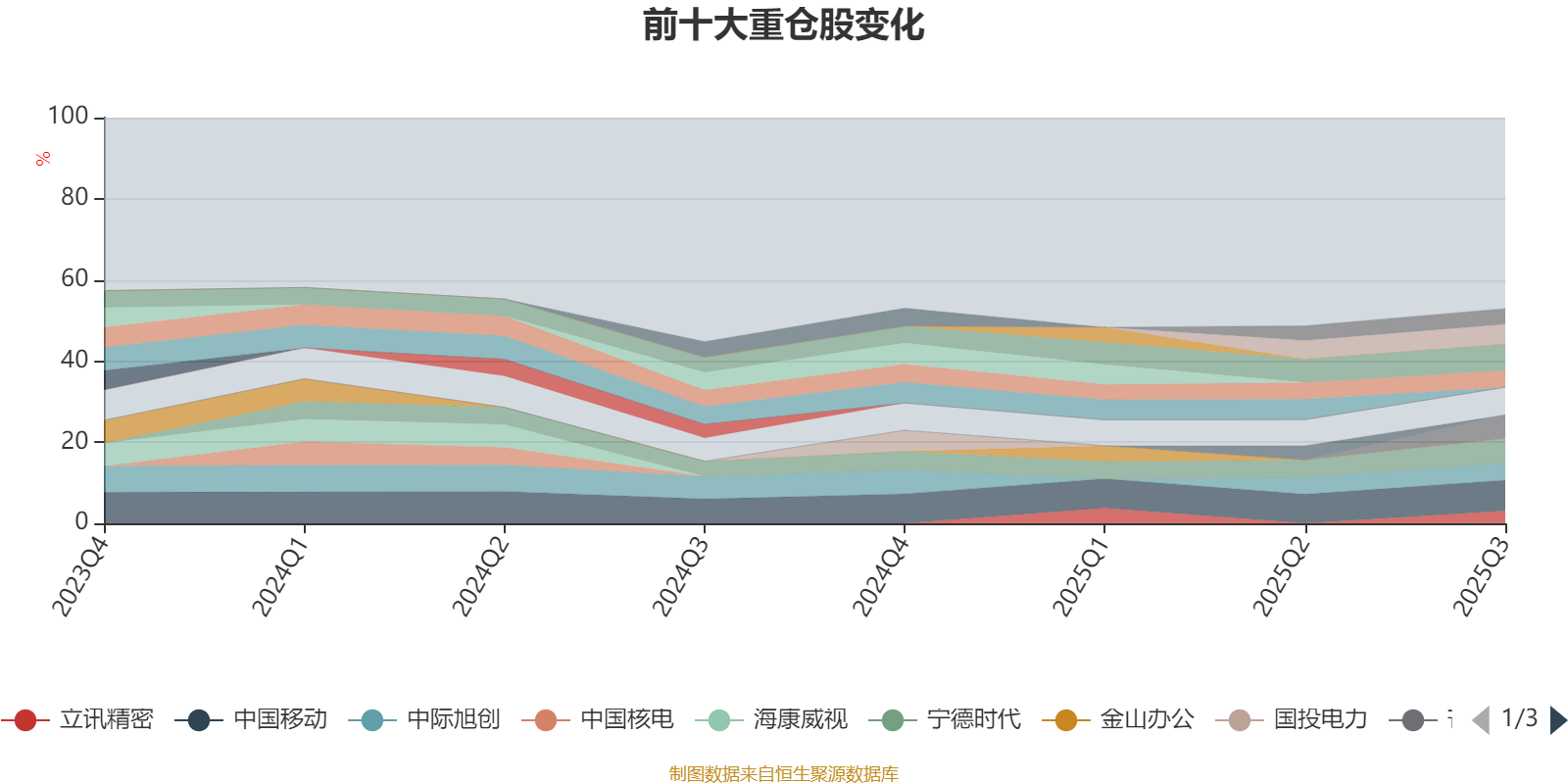 截至2025年三季度末,基金十大重仓股分别是中国移动、长江电力、新易盛、宁德时代、芒果超媒、华能水电、中际旭创、天孚通信、京东方A、立讯精密。