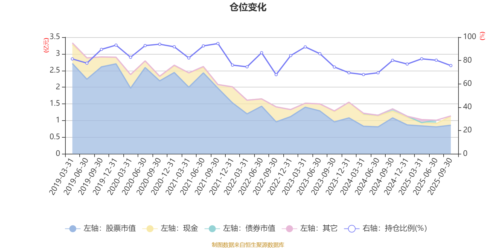 据定期报告数据统计,近三年平均股票仓位为78.17%,同类平均为72.35%。2021年三季度末基金达到94.58%的最高仓位,2022年三季度末最低,为67.92%。