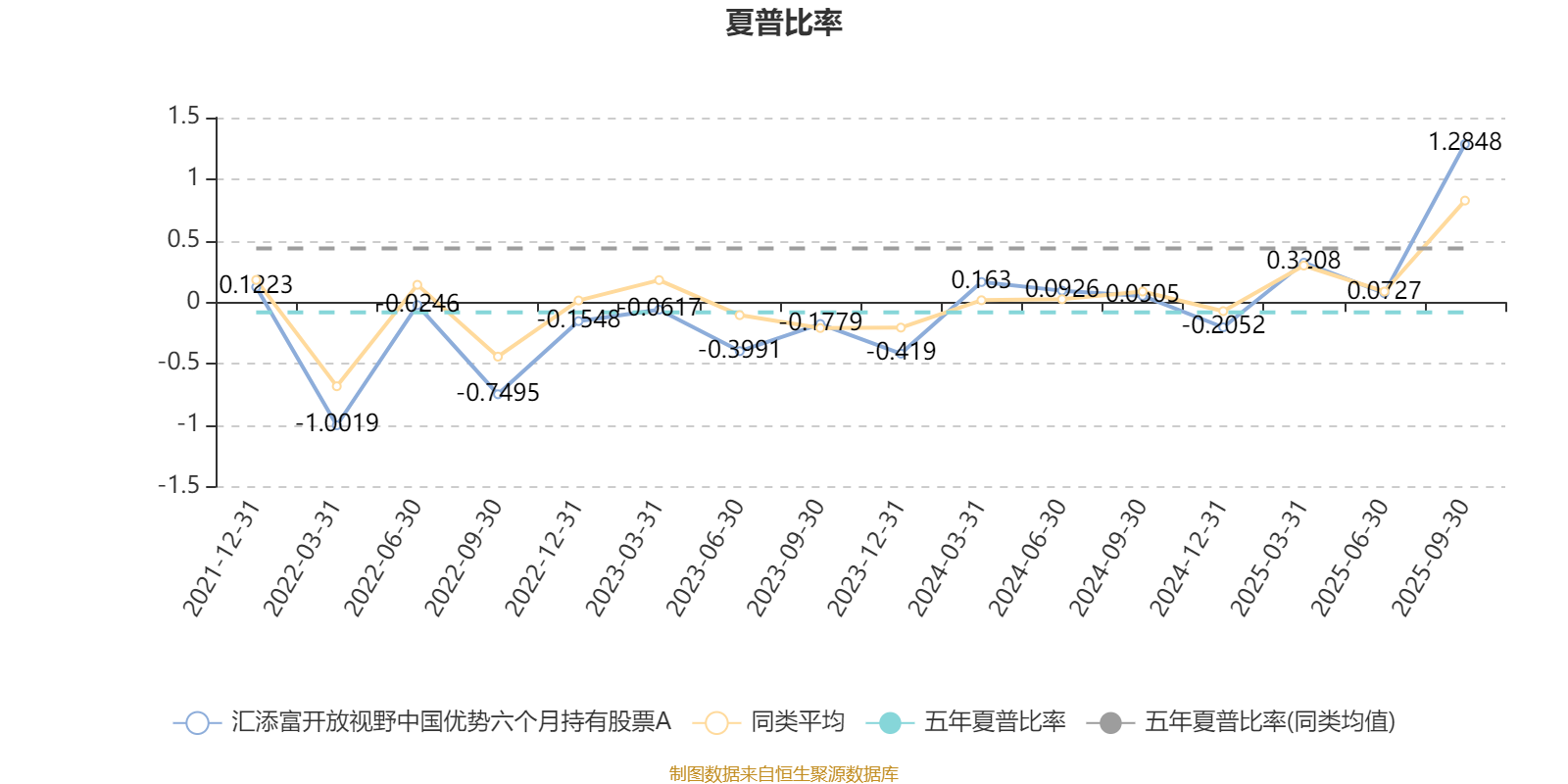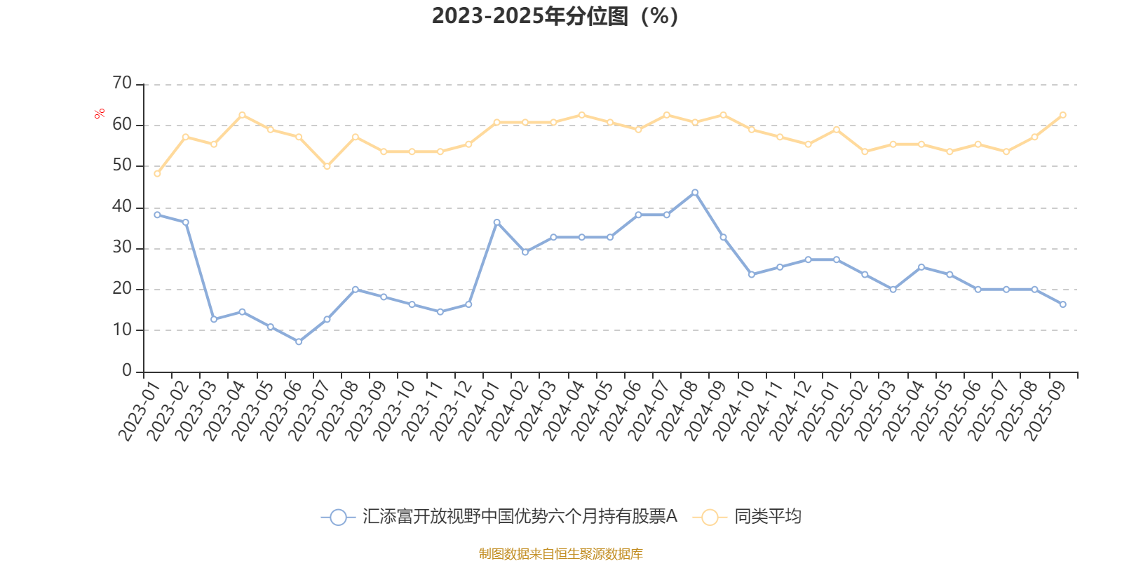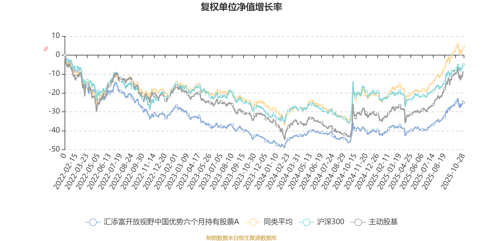 截至10月28日,汇添富开放视野中国优势六个月持有股票A近三个月复权单位净值增长率为14.31%,位于同类可比基金36/58;近半年复权单位净值增长率为24.35%,位于同类可比基金38/57;近一年复权单位净值增长率为22.85%,位于同类可比基金37/57;近三年复权单位净值增长率为12.31%,位于同类可比基金46/56。
