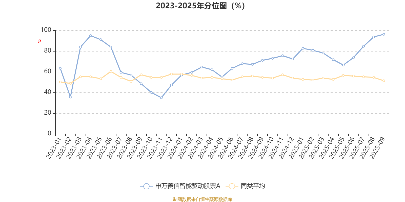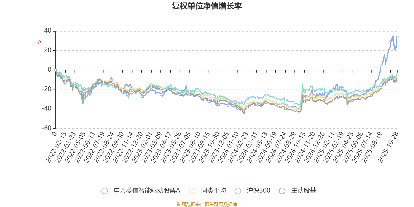 截至10月28日,申万菱信智能驱动股票A近三个月复权单位净值增长率为54.32%,位于同类可比基金1/167;近半年复权单位净值增长率为84.42%,位于同类可比基金2/166;近一年复权单位净值增长率为83.23%,位于同类可比基金4/164;近三年复权单位净值增长率为62.36%,位于同类可比基金16/156。