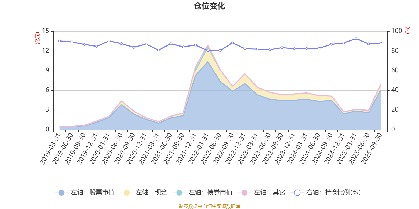 据定期报告数据统计,近三年平均股票仓位为85.01%,同类平均为88.27%。2025年一季度末基金达到92.53%的最高仓位,2022年一季度末最低,为80.26%。