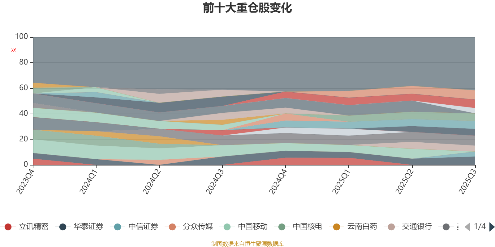 该基金持股集中度较高。截至2025年三季度末,基金十大重仓股分别是美的集团、宁波银行、中国平安、华泰证券、工商银行、兴业银行、南京银行、交通银行、国电电力、中信证券。