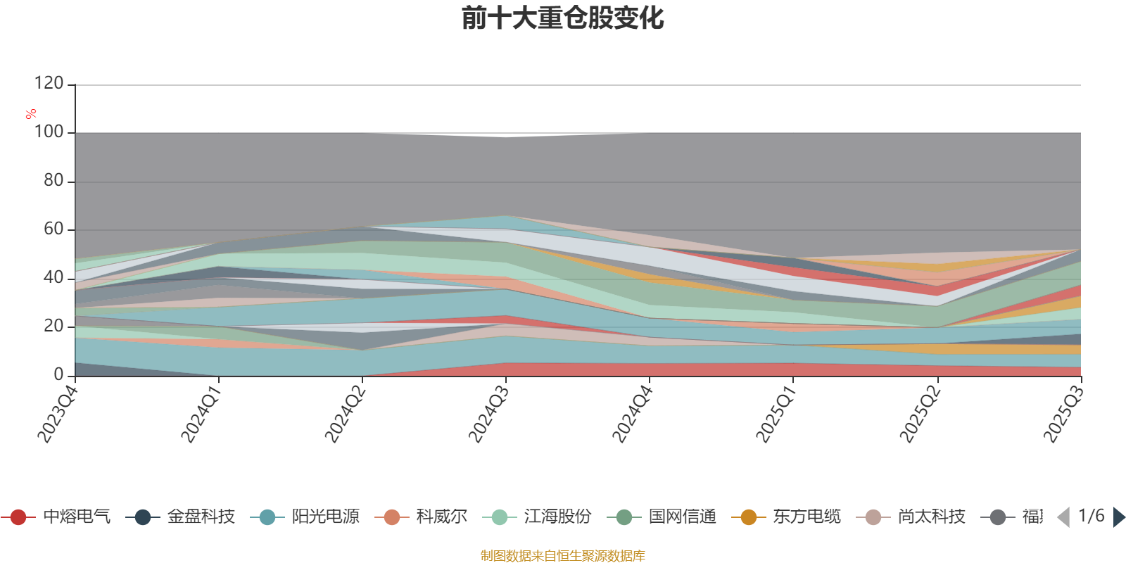 截至2025年三季度末,基金十大重仓股分别是金风科技、宁德时代、阳光电源、中天科技、大金重工、中创新航、科达利、德业股份、东方电缆、中熔电气。