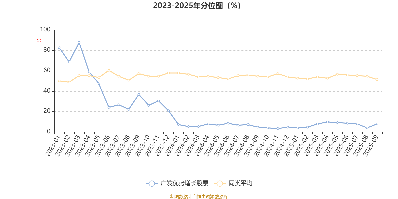通过所选区间该基金净值增长率分位图,可以观察该基金与同类基金业绩比较情况。图为坐标原点到区间内某时点的净值增长率在同类基金中的分位数。