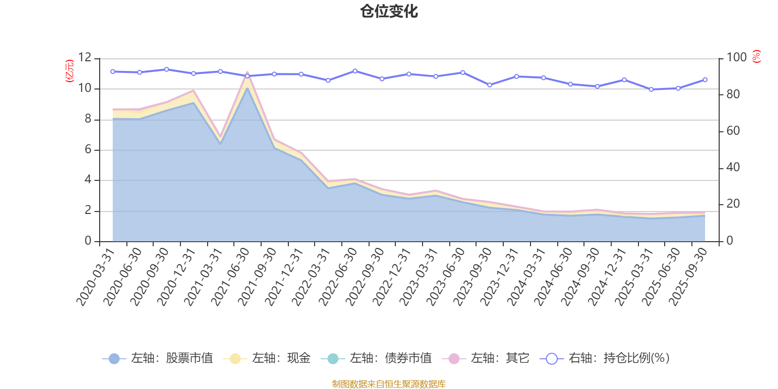 据定期报告数据统计,近三年平均股票仓位为87.72%,同类平均为88.27%。2020年三季度末基金达到93.98%的最高仓位,2025年一季度末最低,为83.02%。
