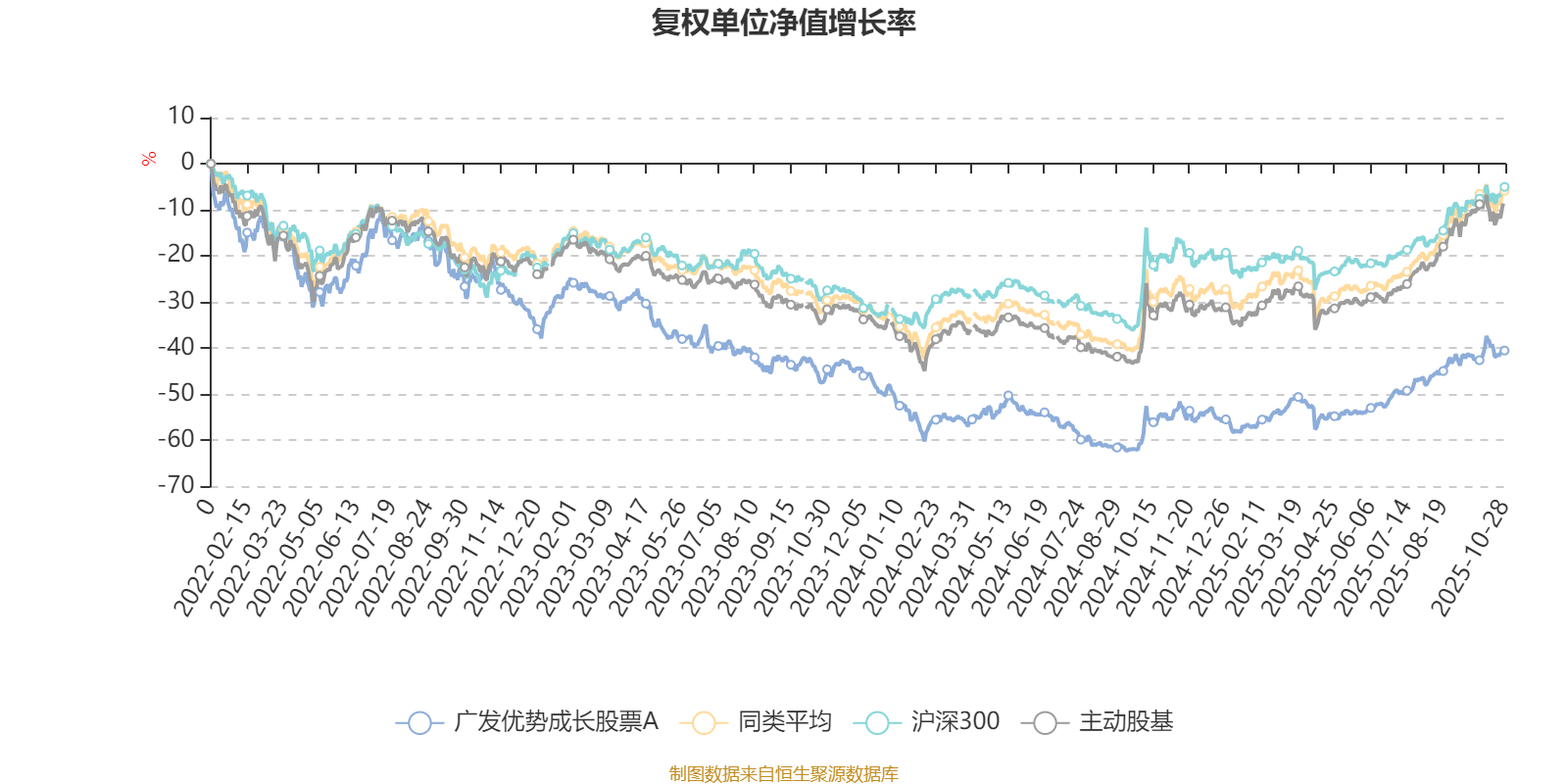 截至10月28日,广发优势成长股票A近三个月复权单位净值增长率为11.72%,位于同类可比基金112/167;近半年复权单位净值增长率为32.66%,位于同类可比基金76/166;近一年复权单位净值增长率为29.80%,位于同类可比基金75/164;近三年复权单位净值增长率为-20.91%,位于同类可比基金153/156。