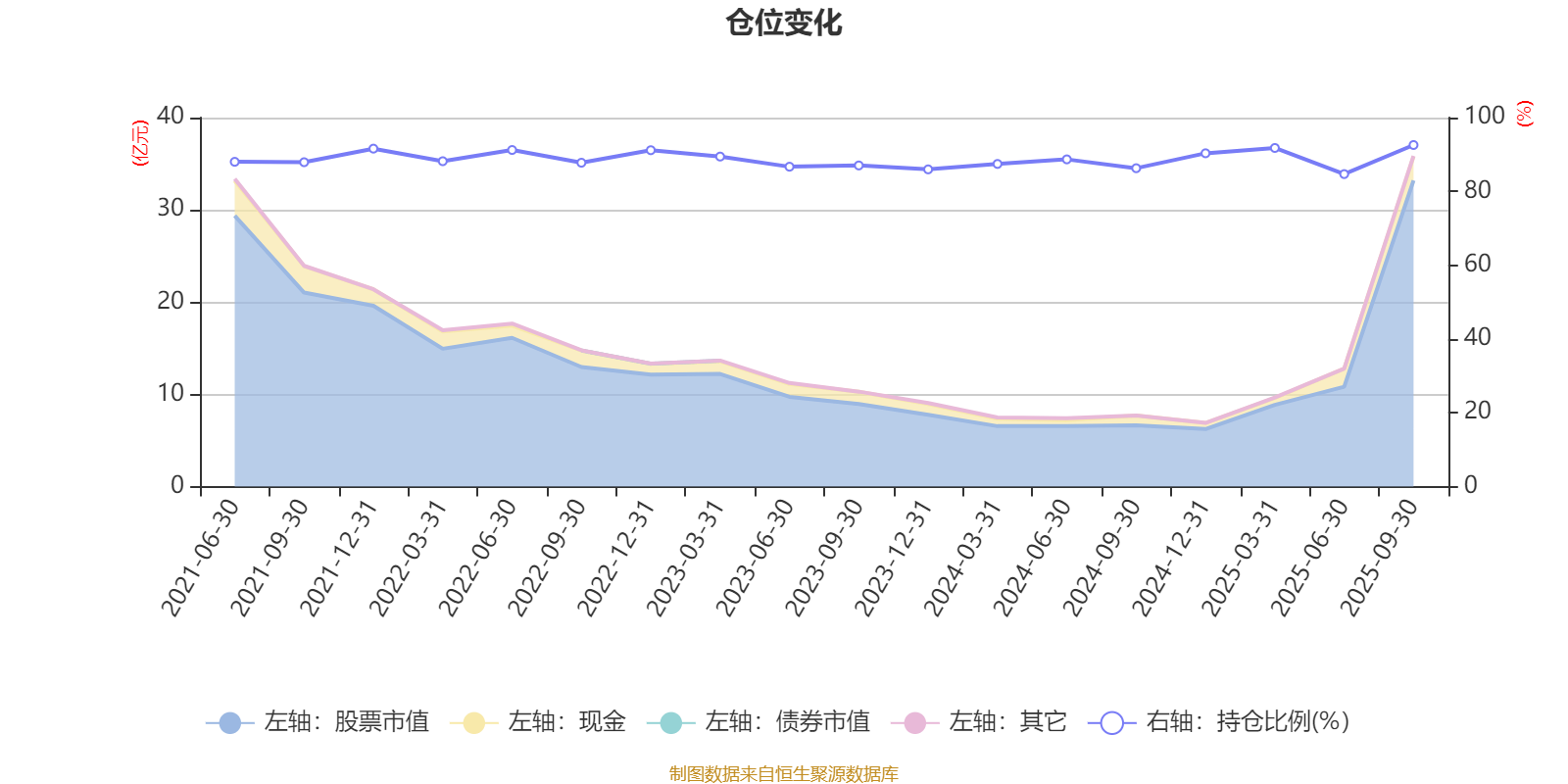 据定期报告数据统计,近三年平均股票仓位为88.5%,同类平均为88.27%。2025年三季度末基金达到92.57%的最高仓位,2025年上半年末最低,为84.69%。