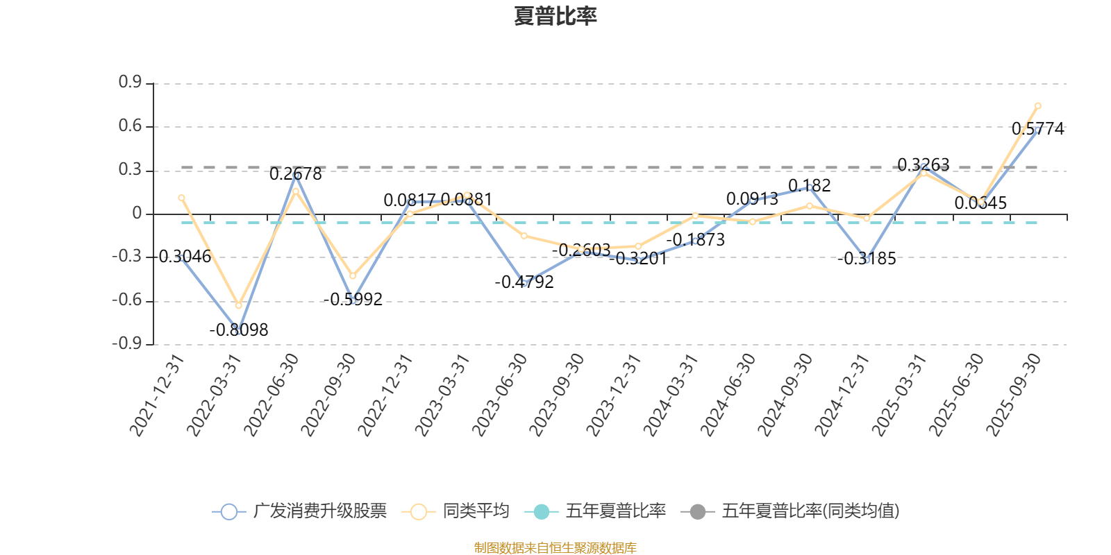 截至9月30日,基金近三年夏普比率为0.2419,位于同类可比基金130/156。
