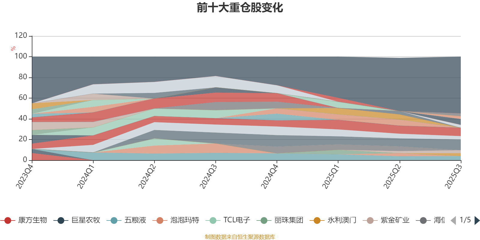 截至2025年三季度末,基金十大重仓股分别是腾讯控股、贵州茅台、阿里巴巴-W、五粮液、美的集团、紫金矿业、珍酒李渡、赛力斯、诺普信、永利澳门。
