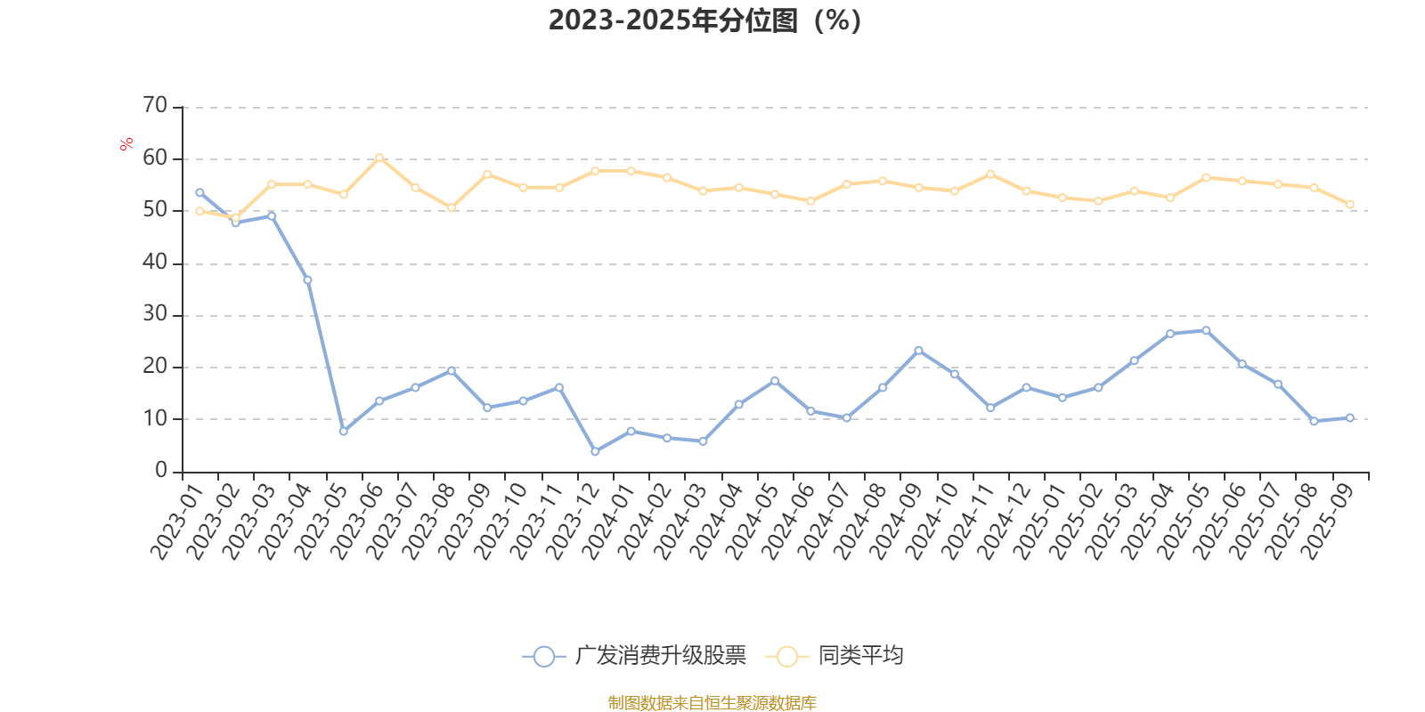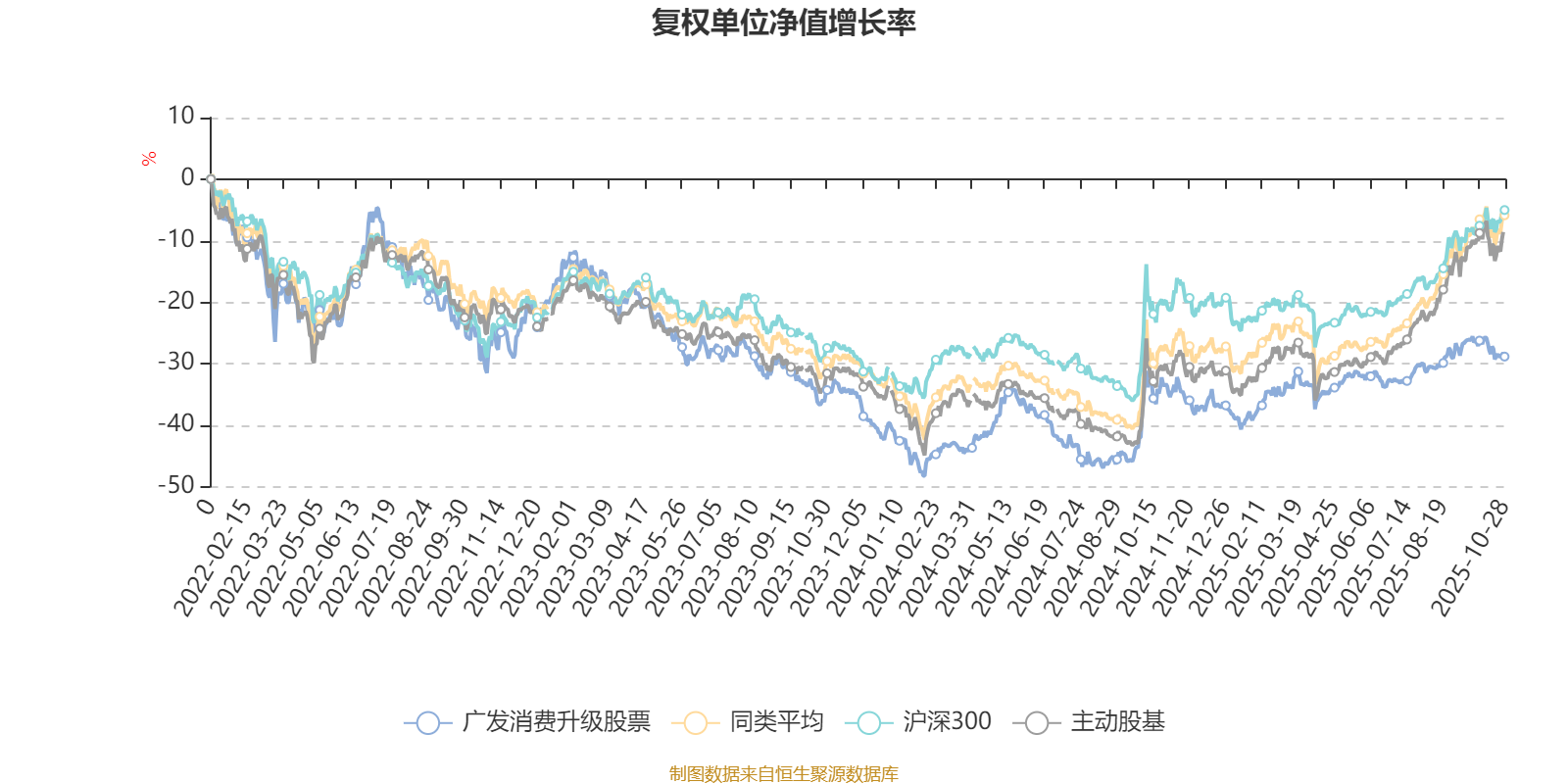 截至10月28日,广发消费升级股票近三个月复权单位净值增长率为1.76%,位于同类可比基金159/167;近半年复权单位净值增长率为7.71%,位于同类可比基金162/166;近一年复权单位净值增长率为6.71%,位于同类可比基金152/164;近三年复权单位净值增长率为2.96%,位于同类可比基金124/156。