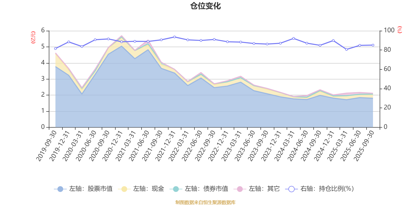 据定期报告数据统计,近三年平均股票仓位为86.78%,同类平均为88.27%。2021年末基金达到93.57%的最高仓位,2025年一季度末最低,为80.63%。