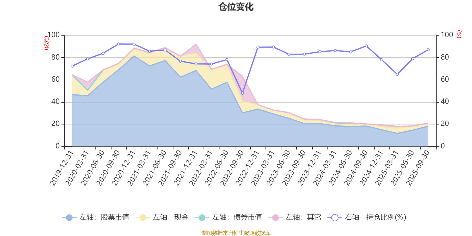 据定期报告数据统计,近三年平均股票仓位为83.48%,同类平均为72.35%。2020年三季度末基金达到92.23%的最高仓位,2022年三季度末最低,为47.96%。