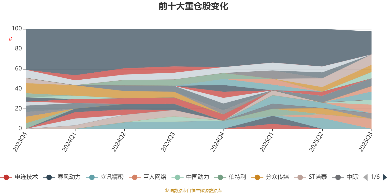 该基金持股集中度较高。截至2025年三季度末,基金十大重仓股分别是新易盛、巨人网络、大金重工、吉比特、沪电股份、天孚通信、亿纬锂能、金风科技、中际旭创、生益科技。