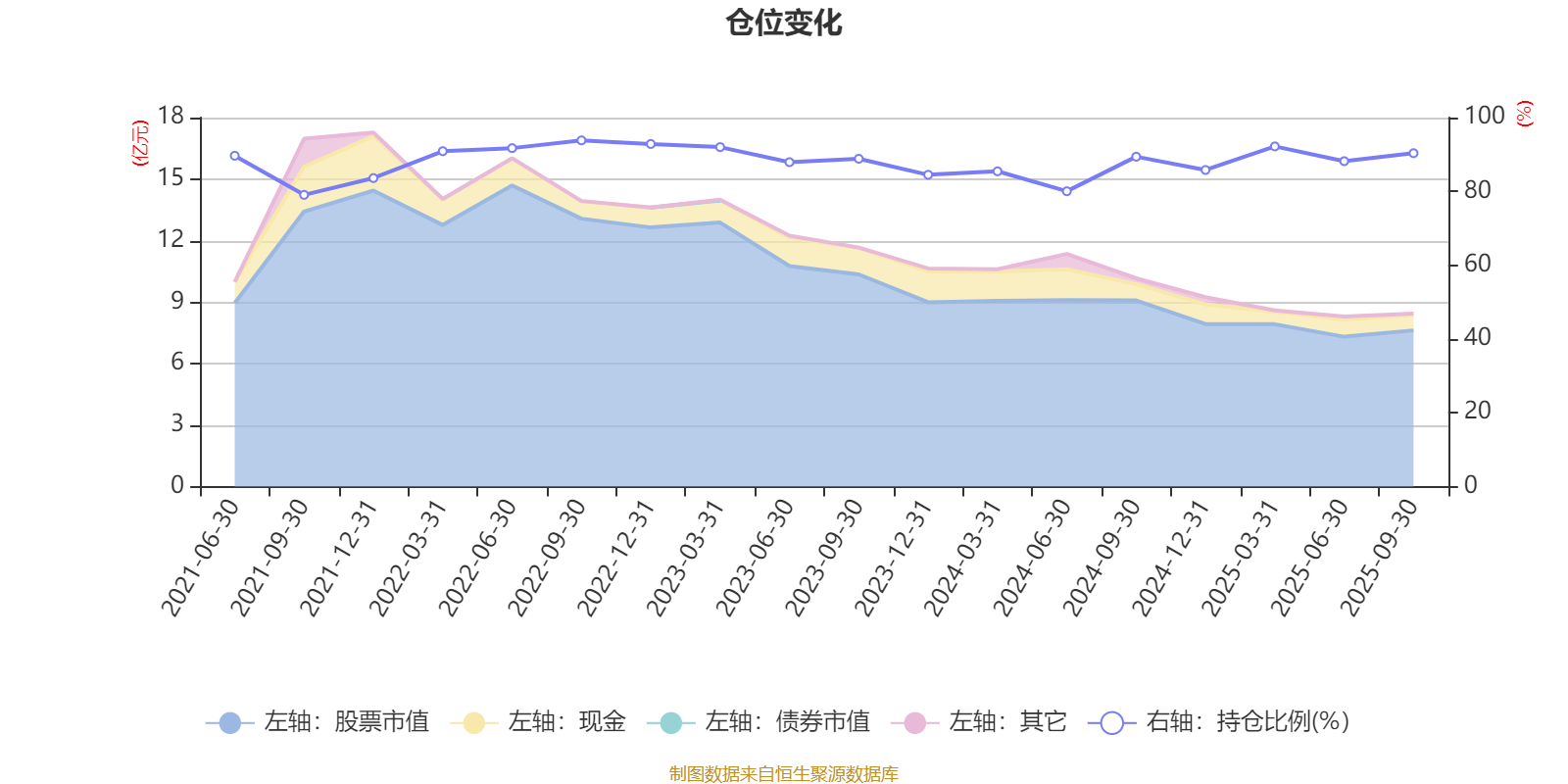 据定期报告数据统计,近三年平均股票仓位为88.13%,同类平均为85.66%。2022年三季度末基金达到93.83%的最高仓位,2021年三季度末最低,为79.06%。