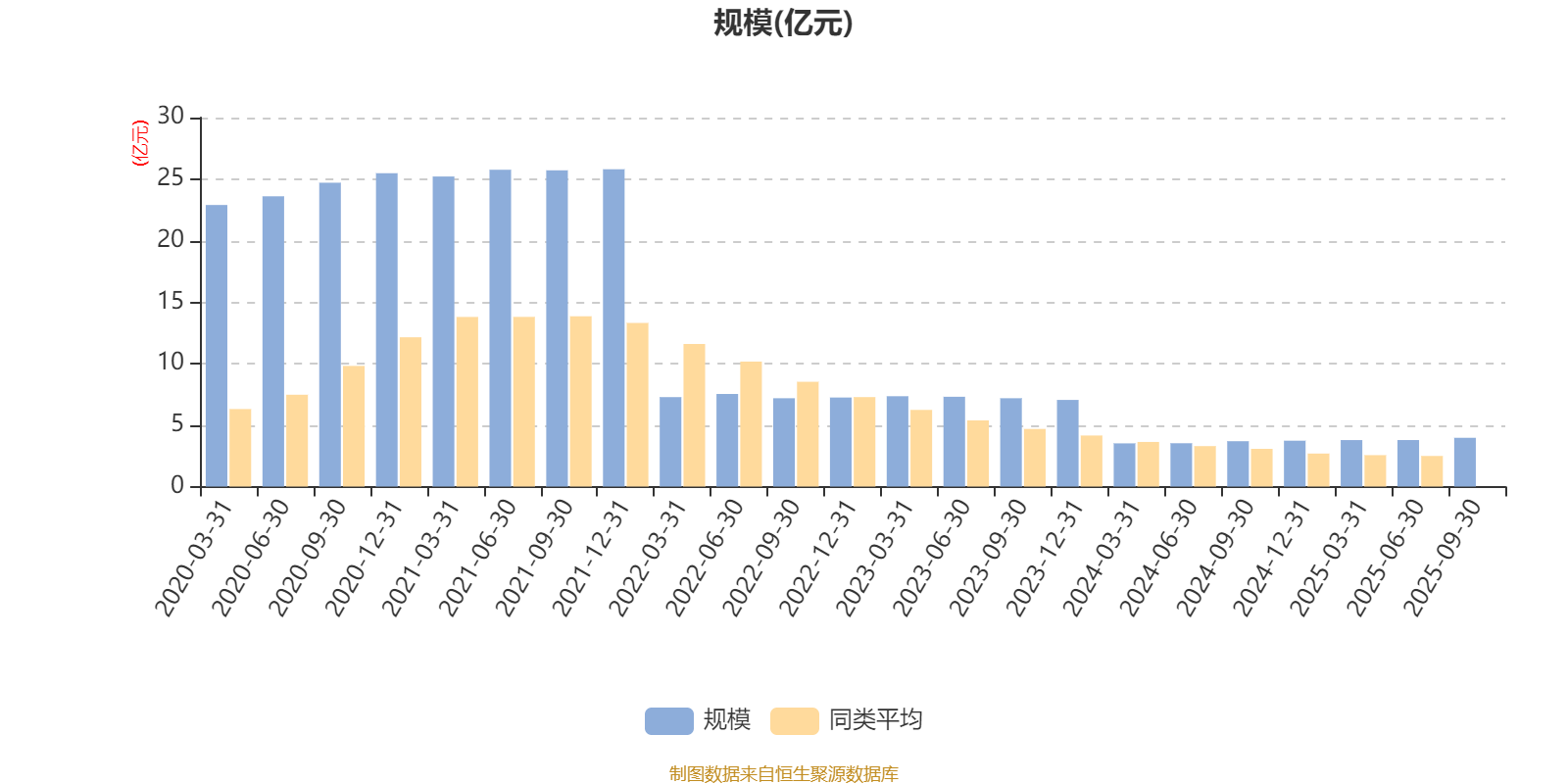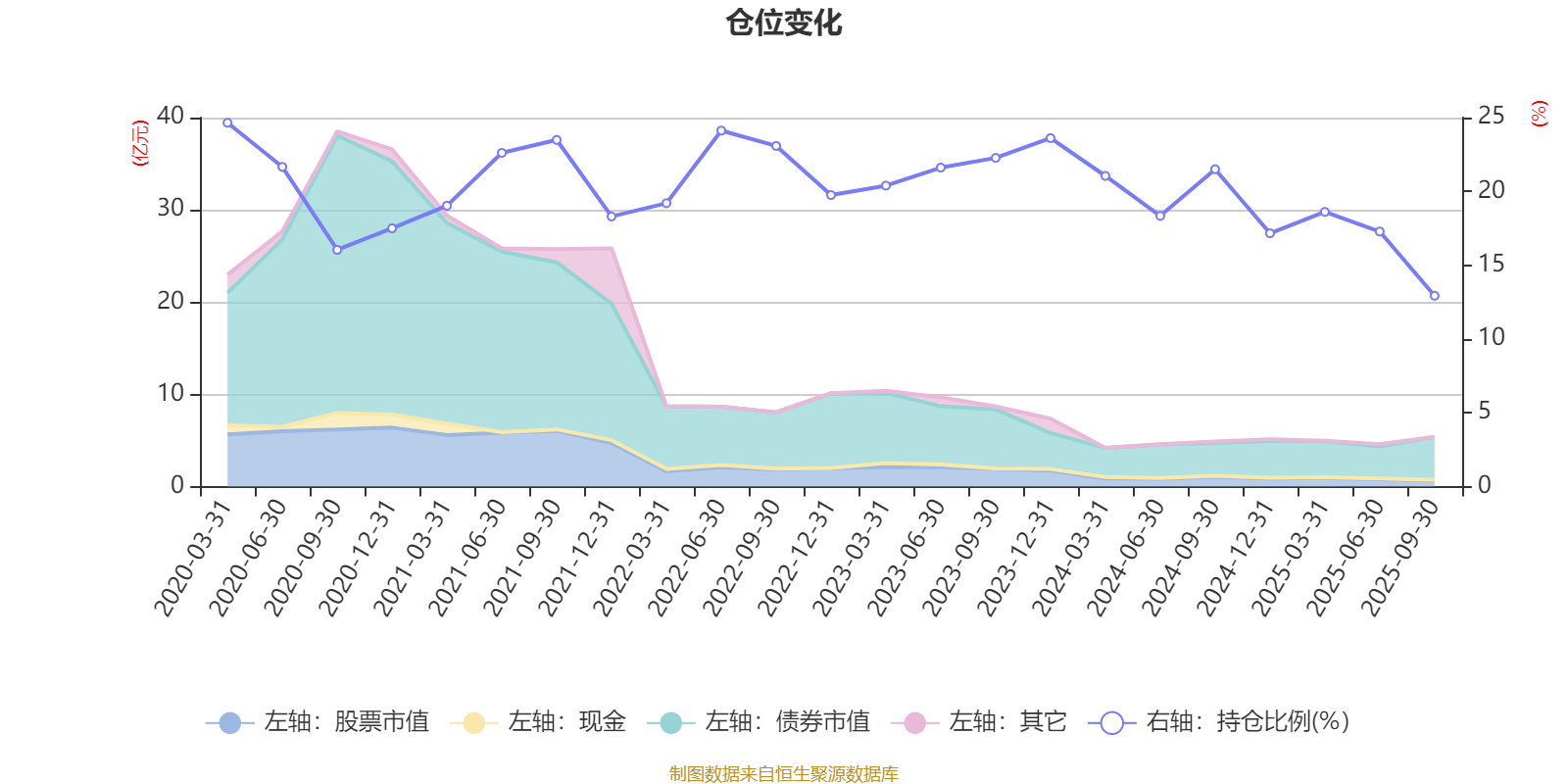 据定期报告数据统计,近三年平均股票仓位为19.54%,同类平均为19.14%。2020年一季度末基金达到24.65%的最高仓位,2025年三季度末最低,为12.93%。