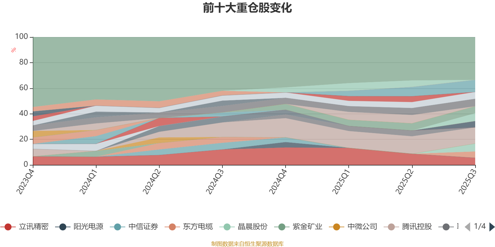 截至2025年三季度末,基金十大重仓股分别是腾讯控股、阿里巴巴-W、晶晨股份、晶澳科技、恒瑞医药、立讯精密、伊利股份、思源电气、东方电缆、建设银行。