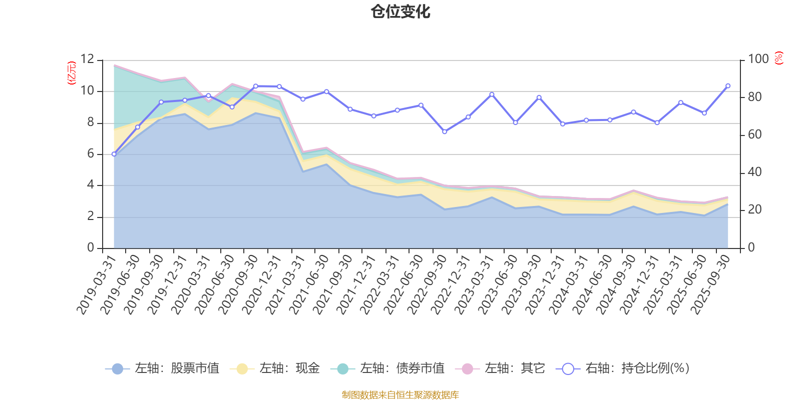 据定期报告数据统计,近三年平均股票仓位为72.93%,同类平均为72.35%。2025年三季度末基金达到86.29%的最高仓位,2019年一季度末最低,为50.04%。