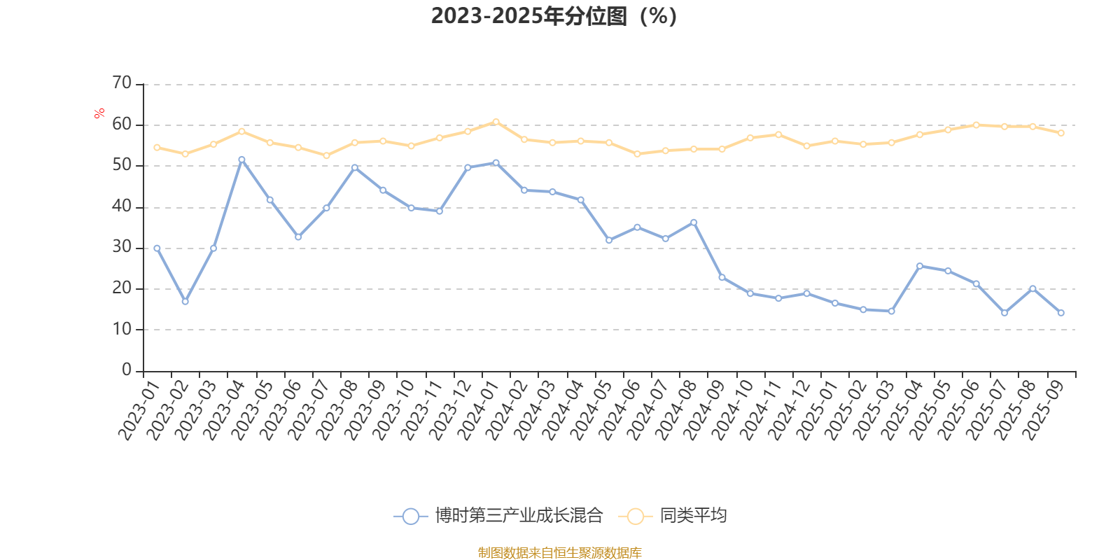 通过所选区间该基金净值增长率分位图,可以观察该基金与同类基金业绩比较情况。图为坐标原点到区间内某时点的净值增长率在同类基金中的分位数。