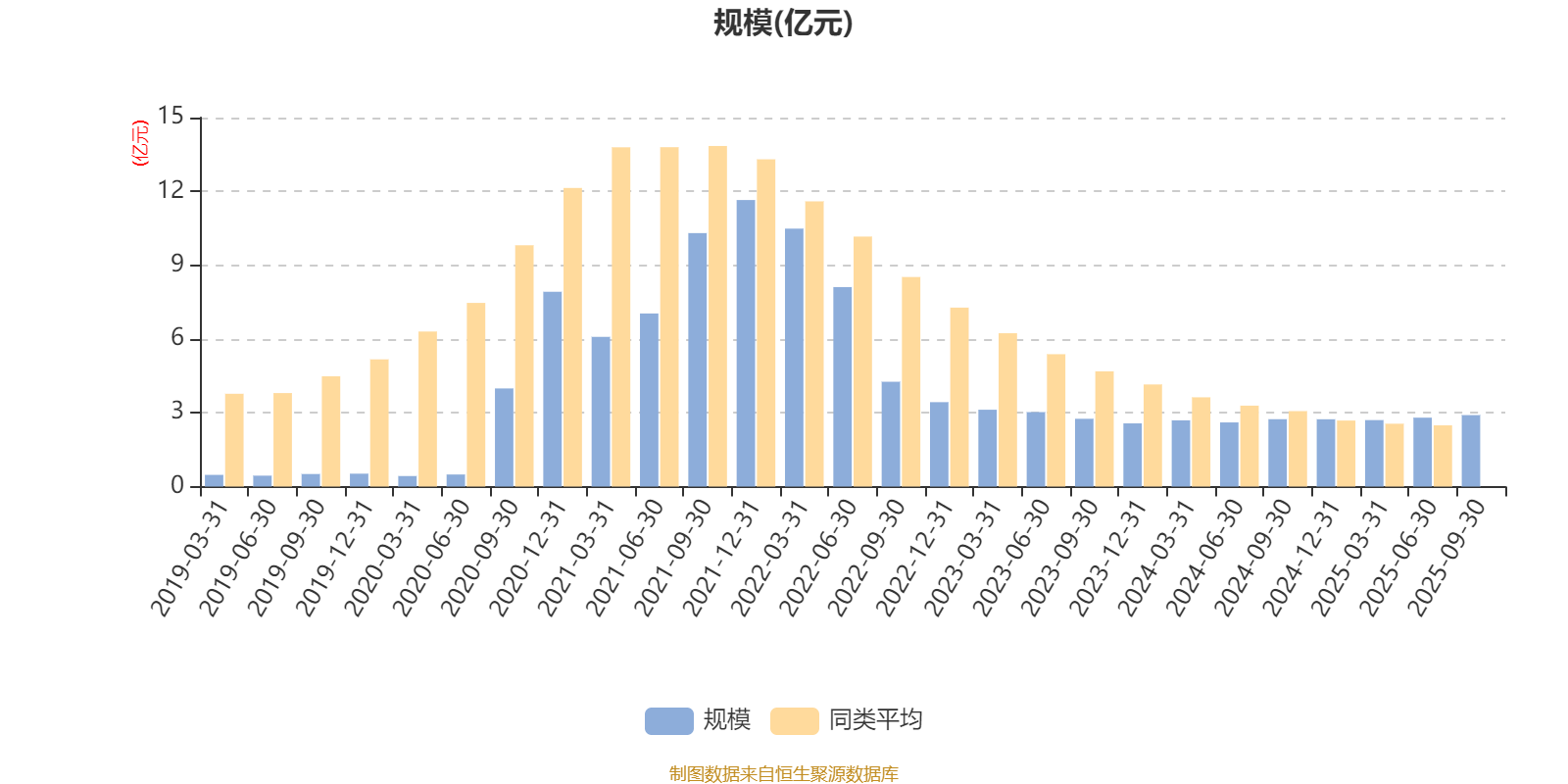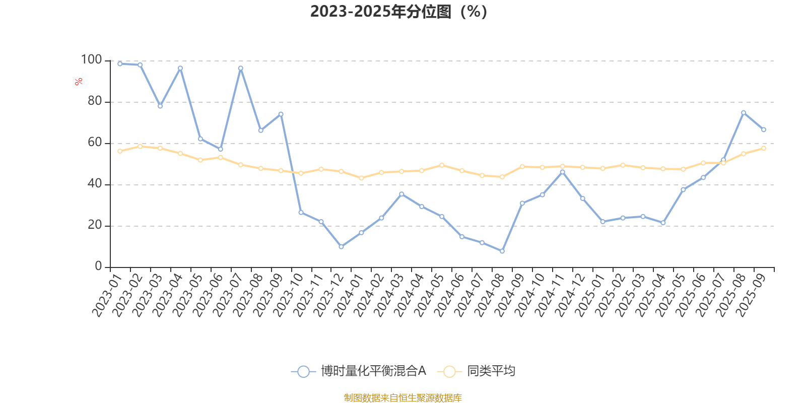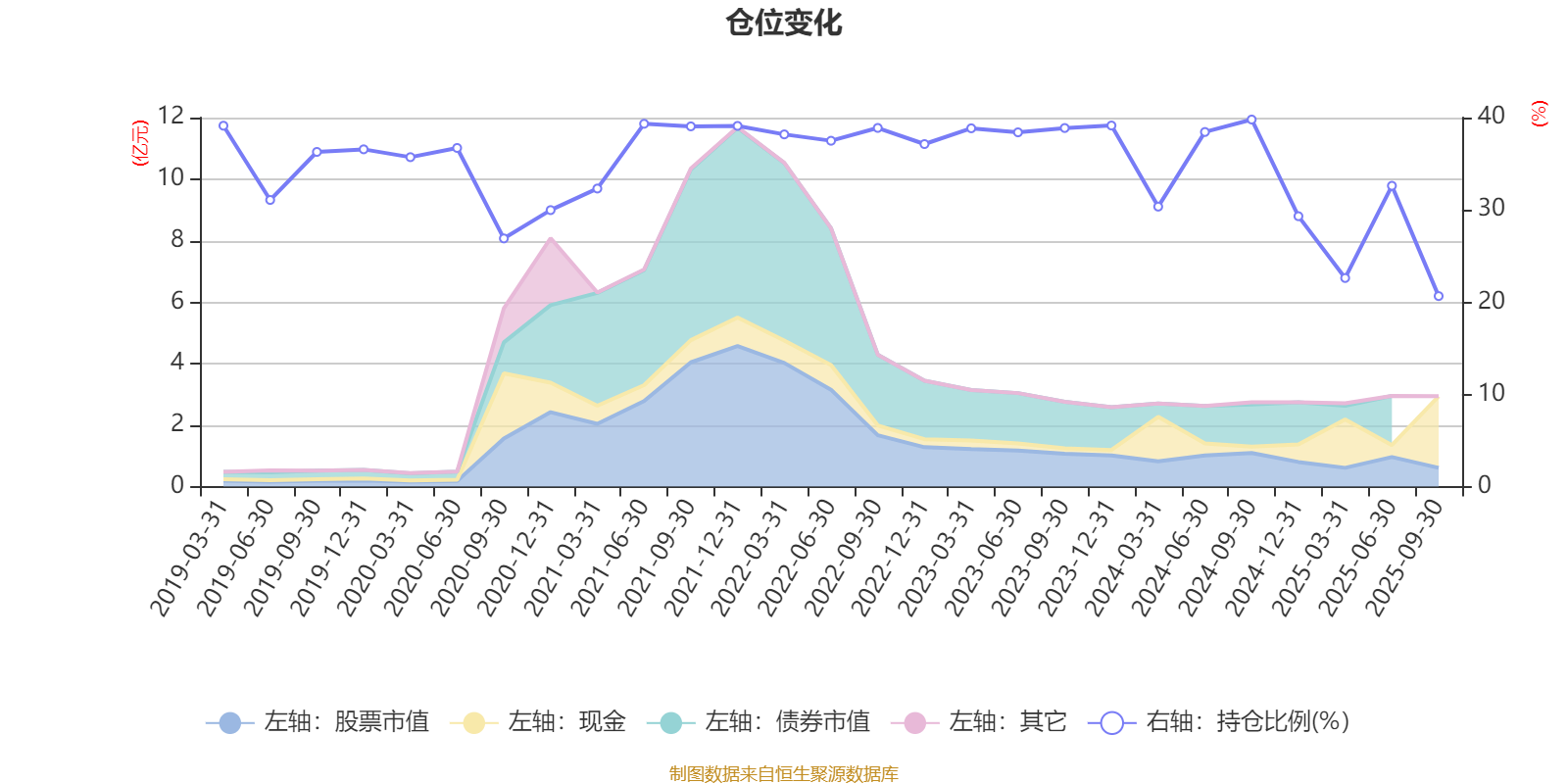 据定期报告数据统计,近三年平均股票仓位为33.85%,同类平均为19.07%。2024年三季度末基金达到39.79%的最高仓位,2025年三季度末最低,为20.65%。