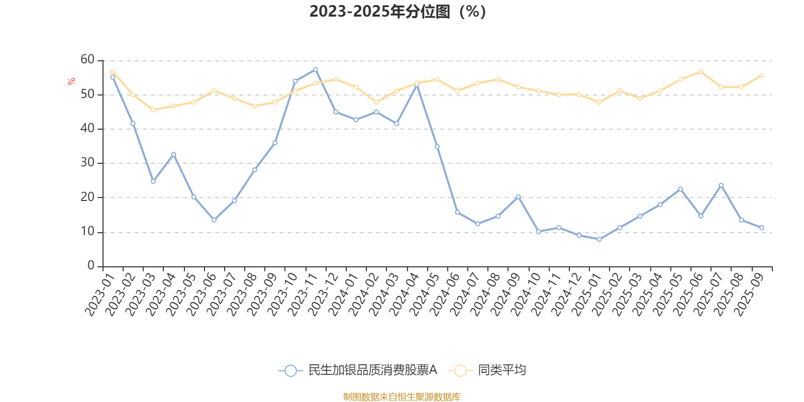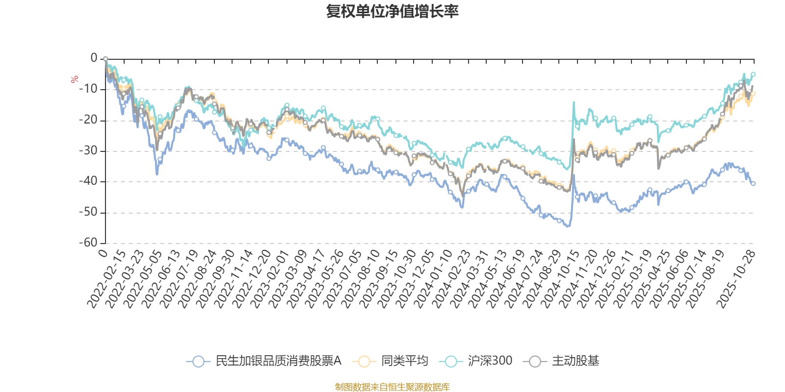 截至10月28日,民生加银品质消费股票A近三个月复权单位净值增长率为-6.63%,位于同类可比基金120/121;近半年复权单位净值增长率为5.11%,位于同类可比基金117/121;近一年复权单位净值增长率为5.59%,位于同类可比基金105/115;近三年复权单位净值增长率为-13.85%,位于同类可比基金78/87。