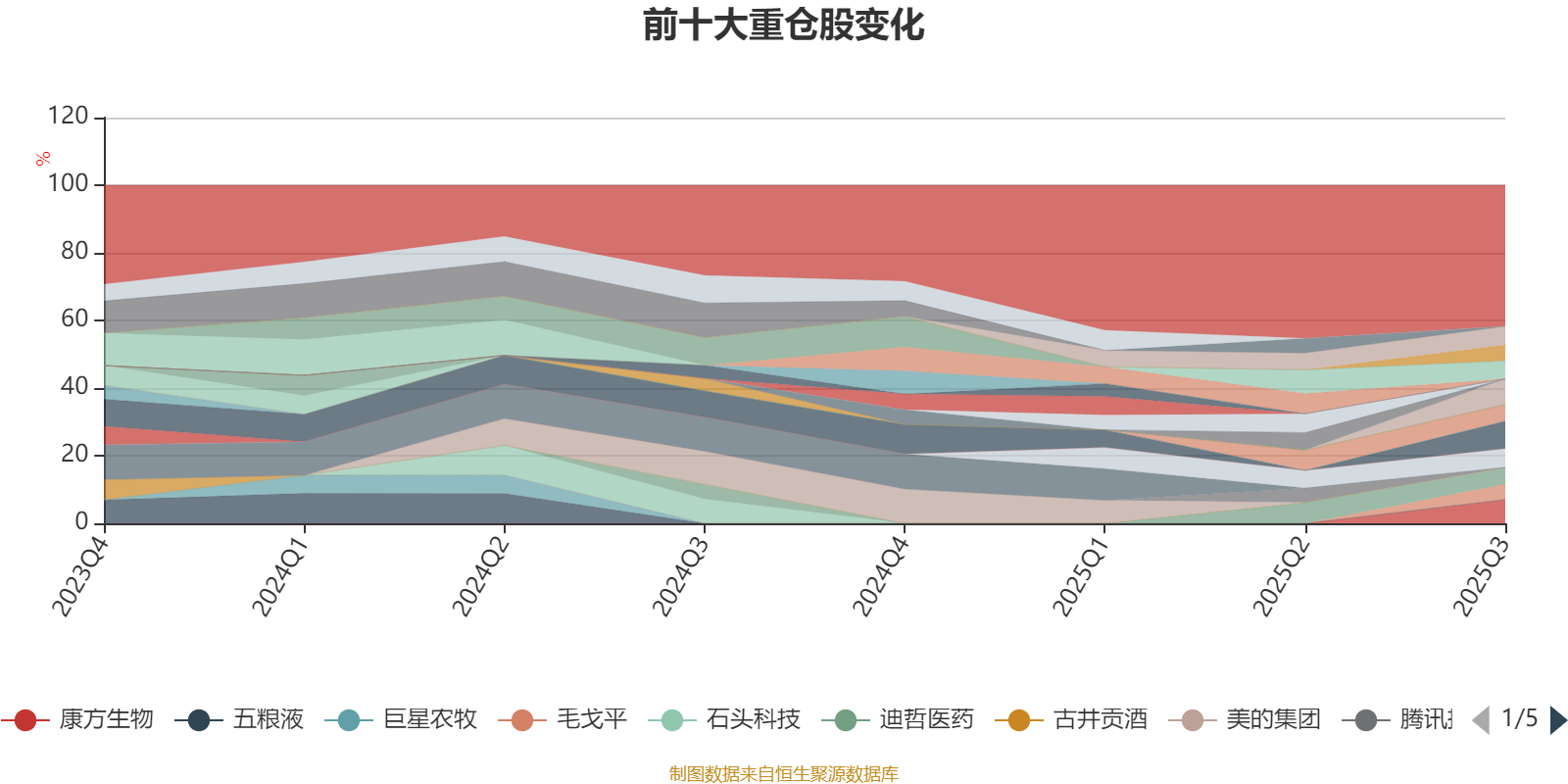 该基金持股集中度较高。截至2025年三季度末,基金十大重仓股分别是联影医疗、科伦博泰生物-B、康方生物、小商品城、东鹏饮料、恒瑞医药、三生制药、迪哲医药、小米集团-W、毛戈平。