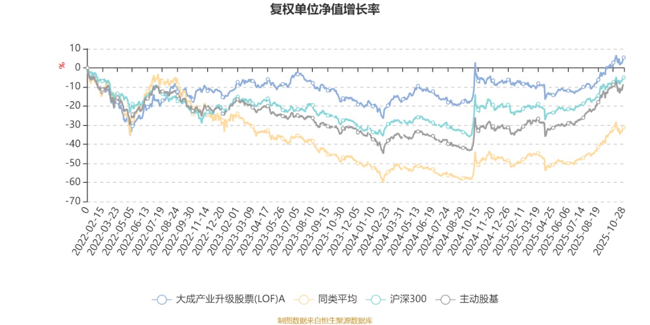 截至10月28日,大成产业升级股票(LOF)A近三个月复权单位净值增长率为15.36%,位于同类可比基金29/39;近半年复权单位净值增长率为23.30%,位于同类可比基金33/39;近一年复权单位净值增长率为11.76%,位于同类可比基金33/38;近三年复权单位净值增长率为20.53%,位于同类可比基金6/29。