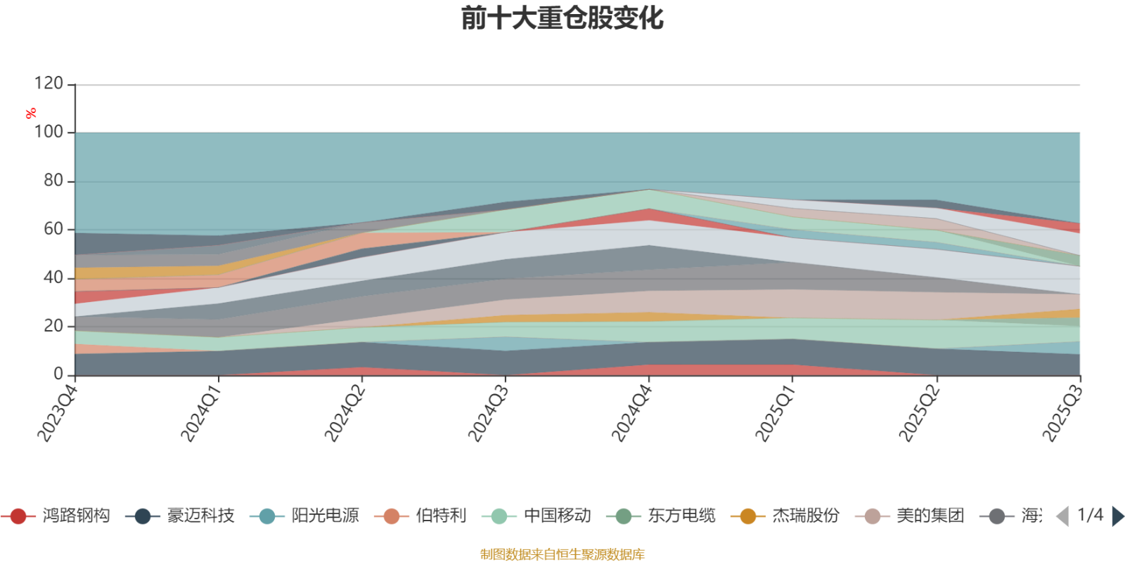 该基金持股集中度较高。截至2025年三季度末,基金十大重仓股分别是宁德时代、爱旭股份、豪迈科技、中国移动、美的集团、阳光电源、恩华药业、安徽合力、东方电缆、杰瑞股份。