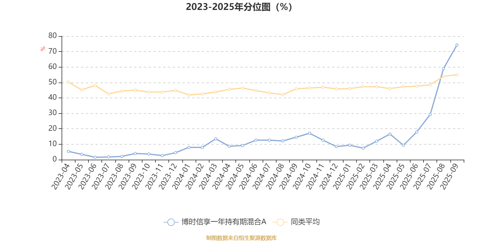 通过所选区间该基金净值增长率分位图,可以观察该基金与同类基金业绩比较情况。图为坐标原点到区间内某时点的净值增长率在同类基金中的分位数。
