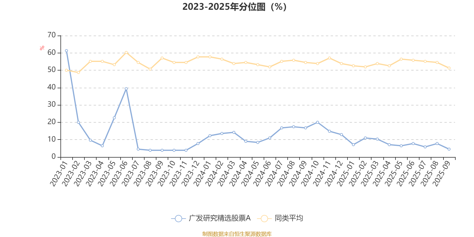 通过所选区间该基金净值增长率分位图,可以观察该基金与同类基金业绩比较情况。图为坐标原点到区间内某时点的净值增长率在同类基金中的分位数。