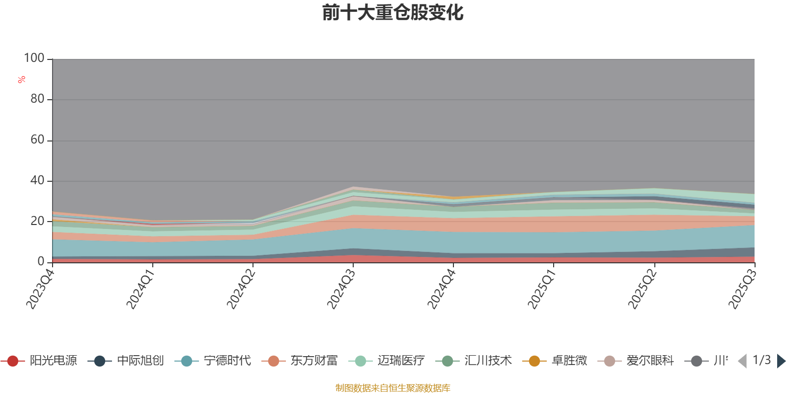 且持股标的较为稳定。截至2025年三季度末,基金十大重仓股分别是宁德时代、中际旭创、新易盛、东方财富、阳光电源、胜宏科技、汇川技术、迈瑞医疗、亿纬锂能、川宁生物。