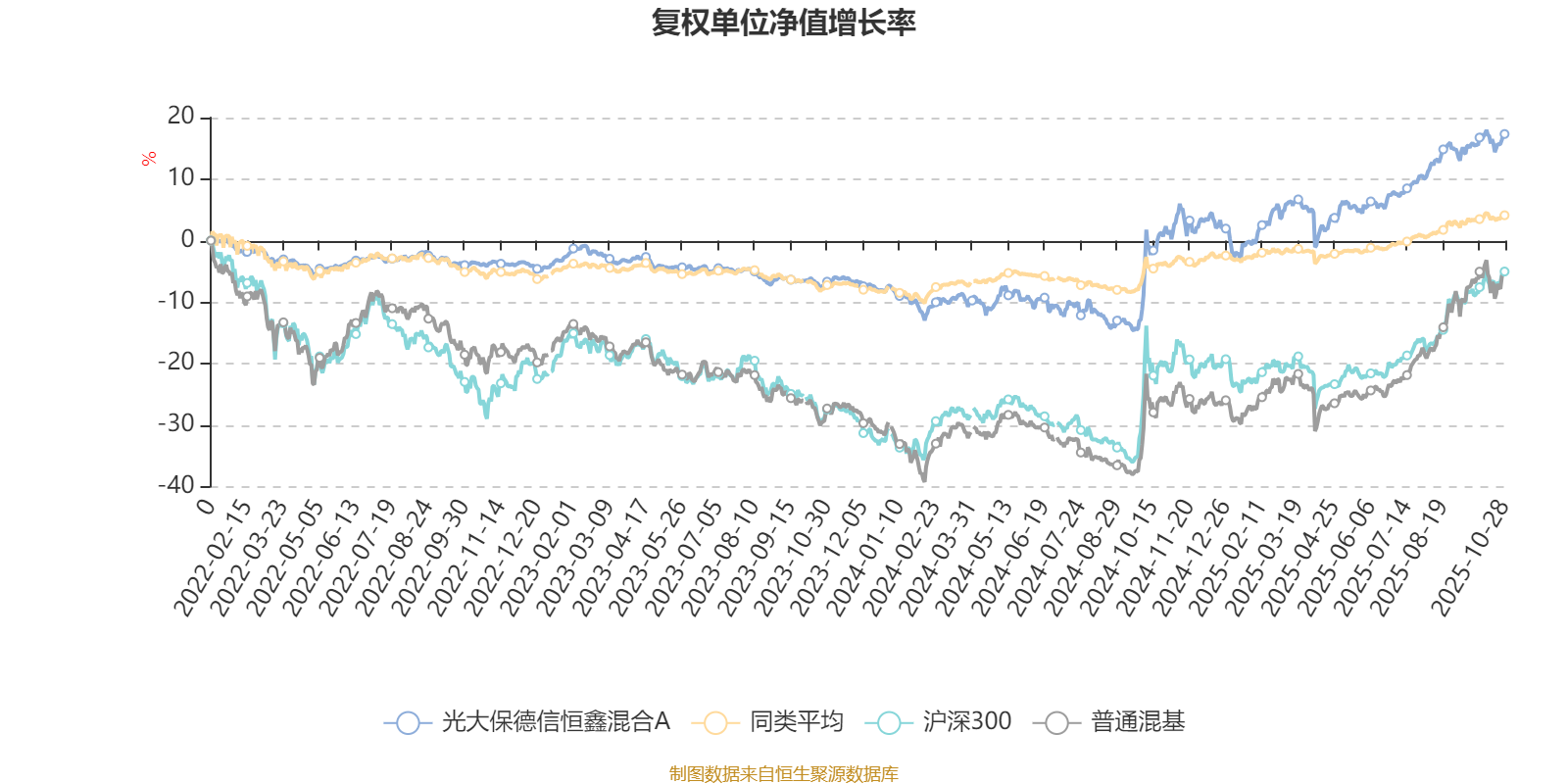 截至10月28日,光大保德信恒鑫混合A近三个月复权单位净值增长率为6.24%,位于同类可比基金65/629;近半年复权单位净值增长率为13.91%,位于同类可比基金42/629;近一年复权单位净值增长率为14.66%,位于同类可比基金52/623;近三年复权单位净值增长率为22.28%,位于同类可比基金60/557。