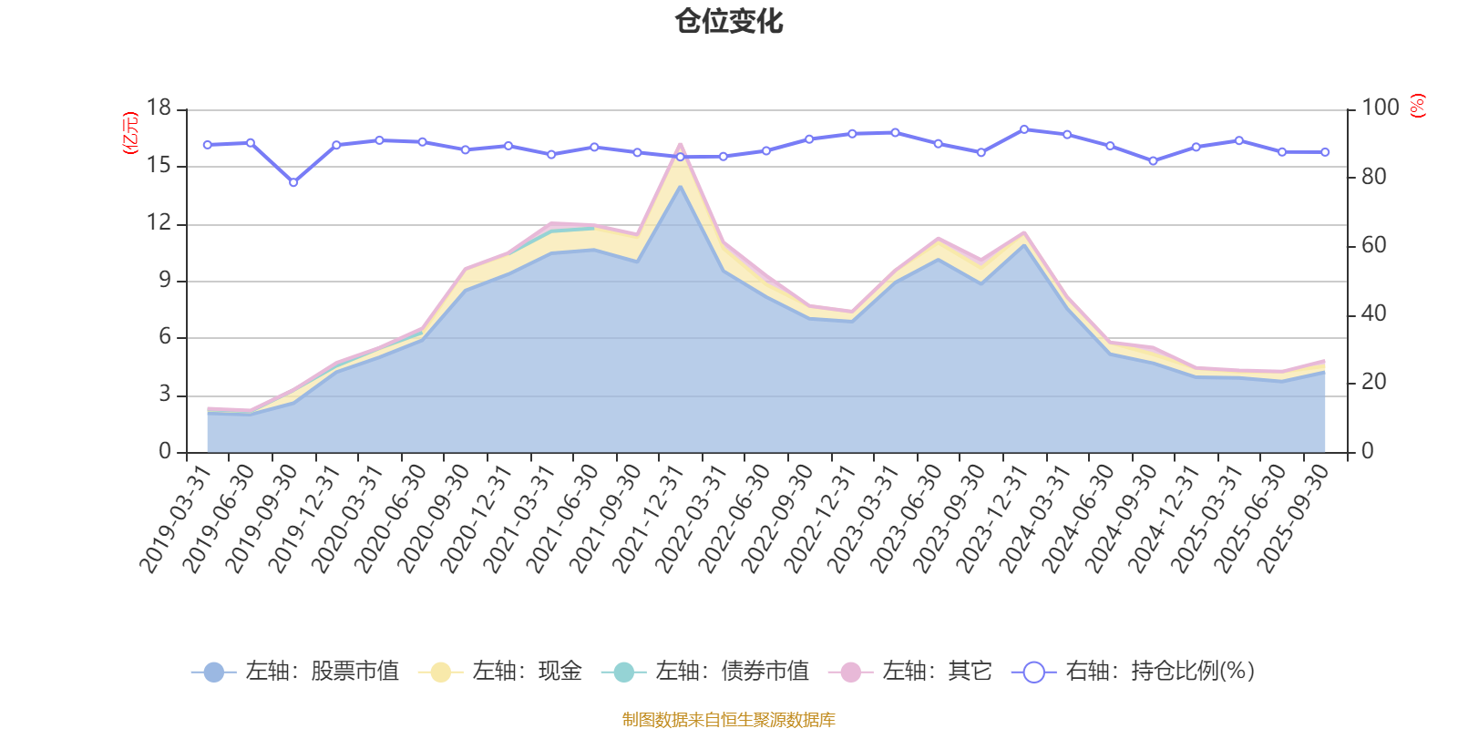 据定期报告数据统计,近三年平均股票仓位为89.98%,同类平均为85.66%。2023年末基金达到94.18%的最高仓位,2019年三季度末最低,为78.7%。