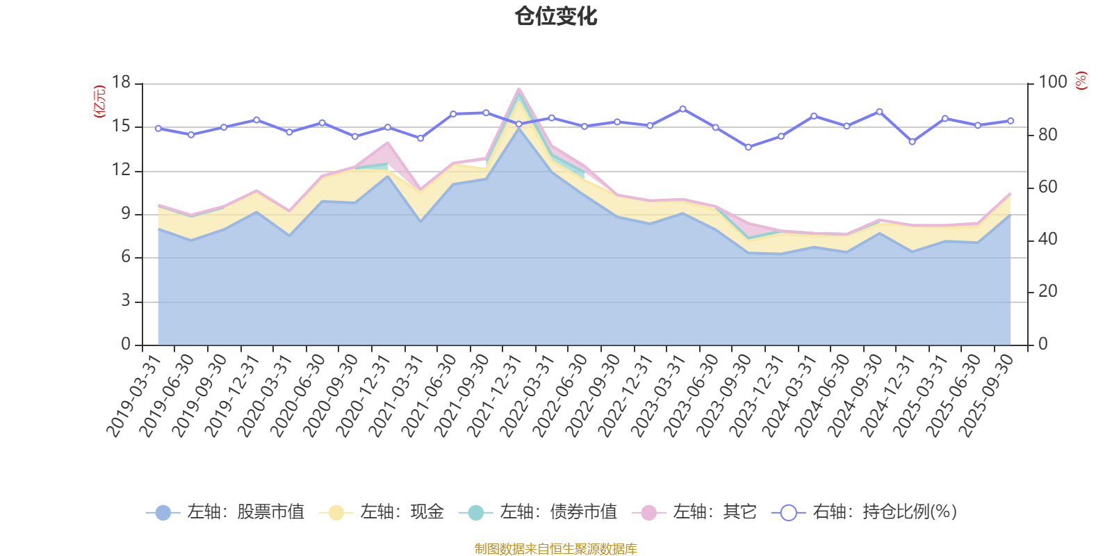 据定期报告数据统计,近三年平均股票仓位为83.93%,同类平均为85.99%。2023年一季度末基金达到90.25%的最高仓位,2023年三季度末最低,为75.64%。