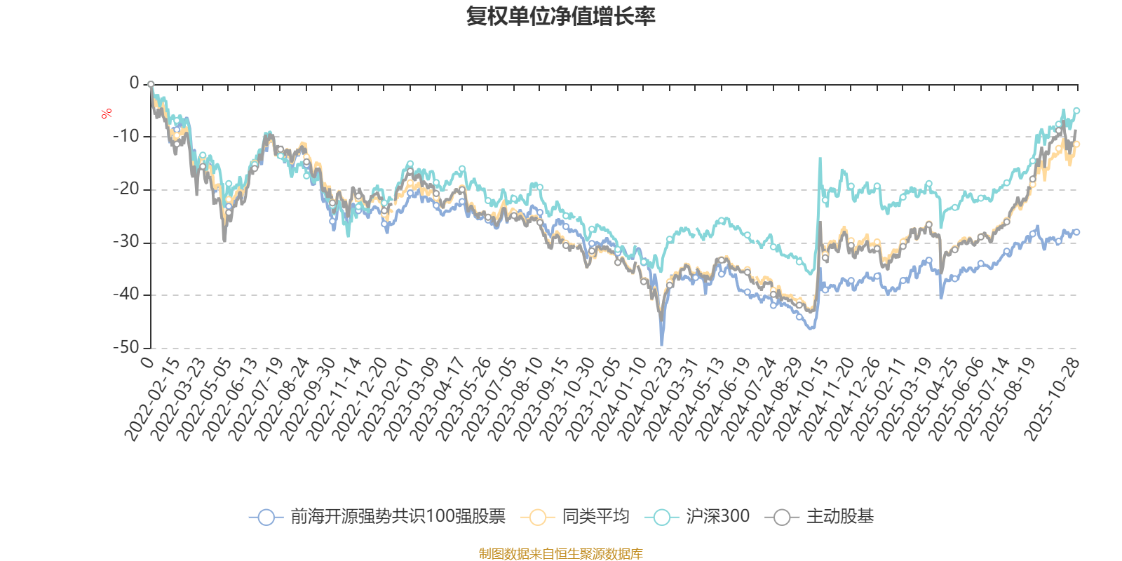 截至10月28日,前海开源强势共识100强股票近三个月复权单位净值增长率为3.19%,位于同类可比基金101/121;近半年复权单位净值增长率为14.30%,位于同类可比基金94/121;近一年复权单位净值增长率为16.14%,位于同类可比基金78/115;近三年复权单位净值增长率为-0.39%,位于同类可比基金70/87。