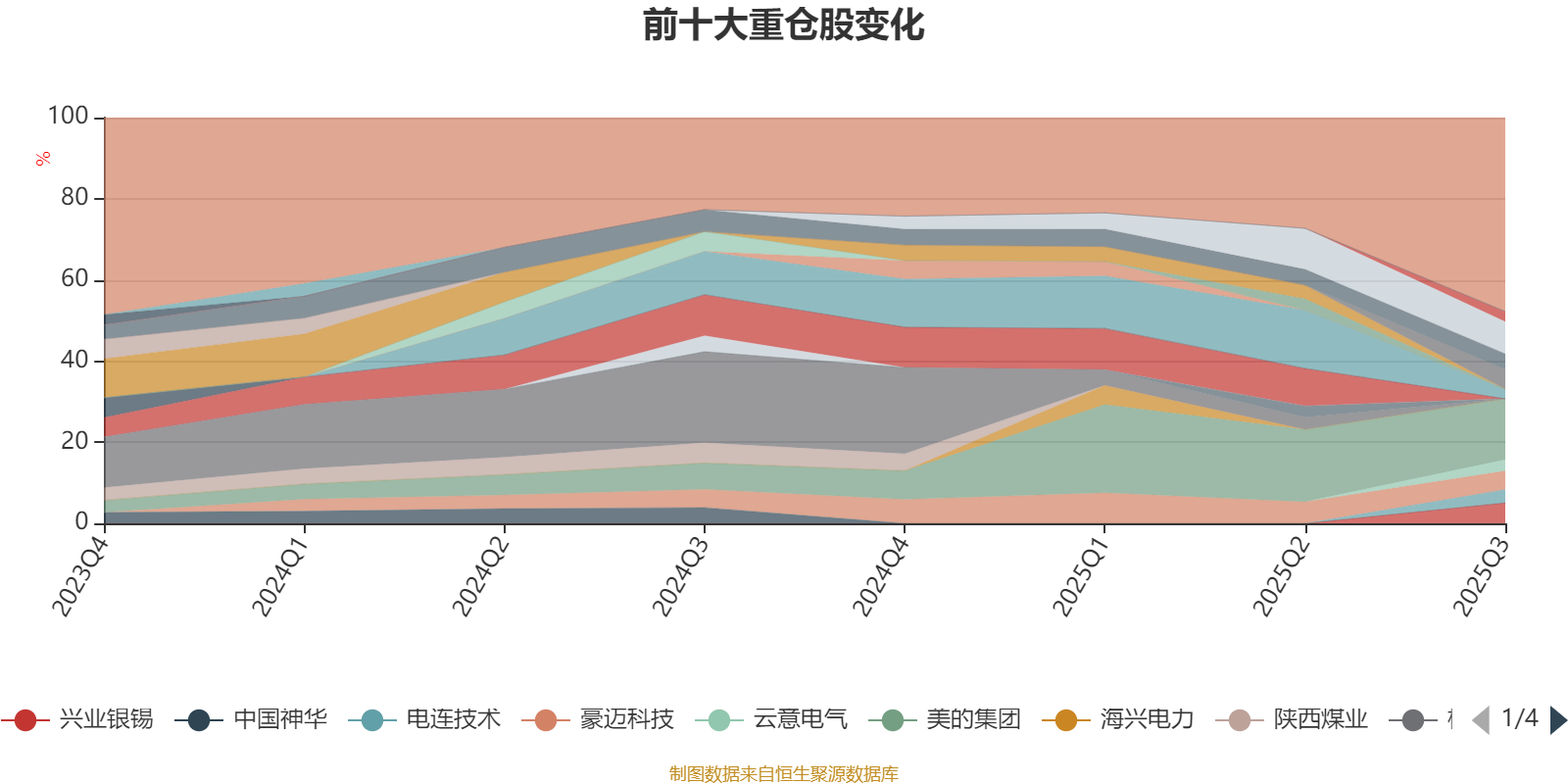 该基金持股集中度较高。截至2025年三季度末,基金十大重仓股分别是美的集团、齐鲁银行、兴业银锡、锡业股份、豪迈科技、招商轮船、电连技术、云意电气、华立科技、渝农商行。