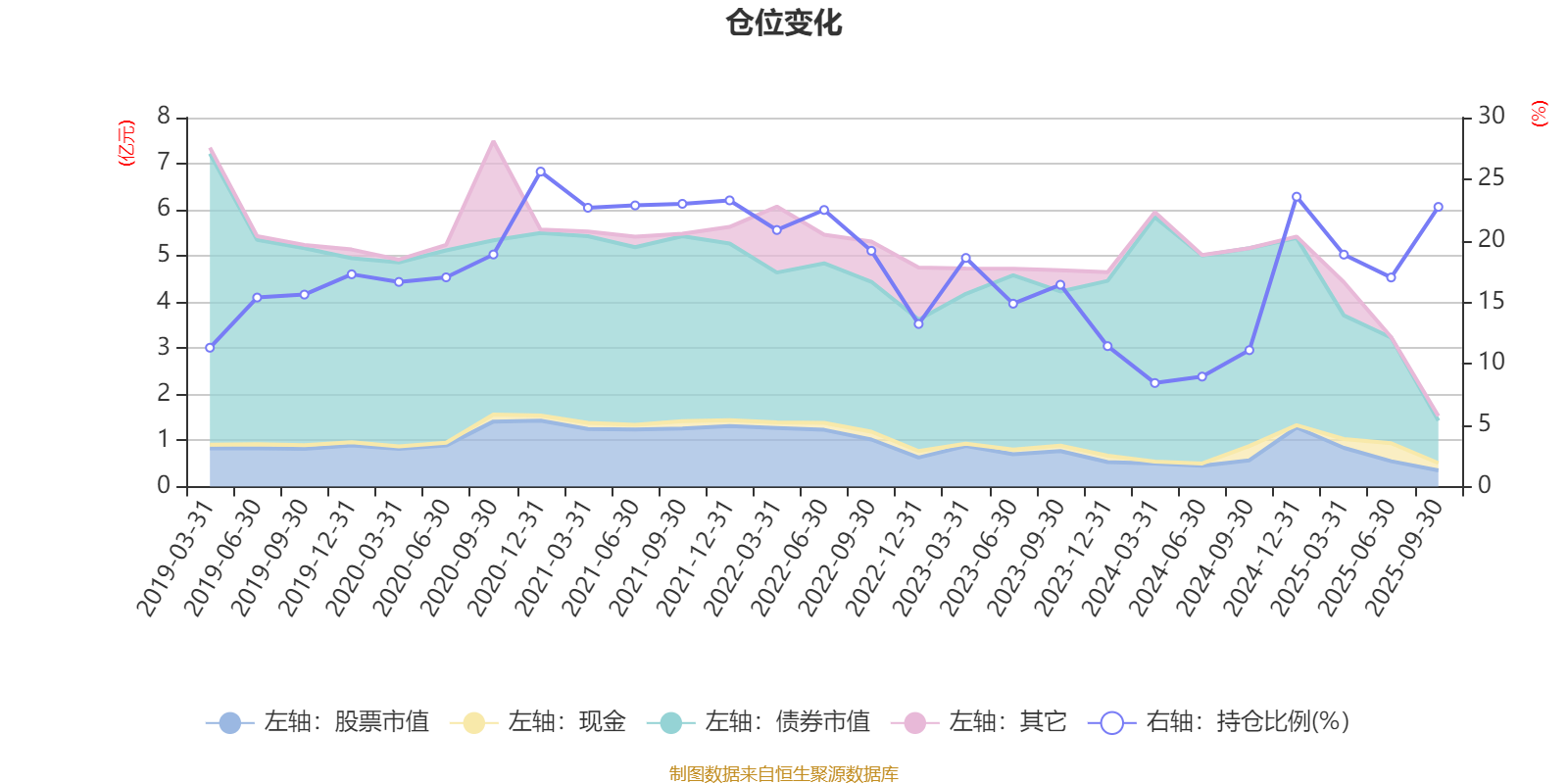 据定期报告数据统计,近三年平均股票仓位为15.43%,同类平均为72.35%。2020年末基金达到25.61%的最高仓位,2024年一季度末最低,为8.42%。
