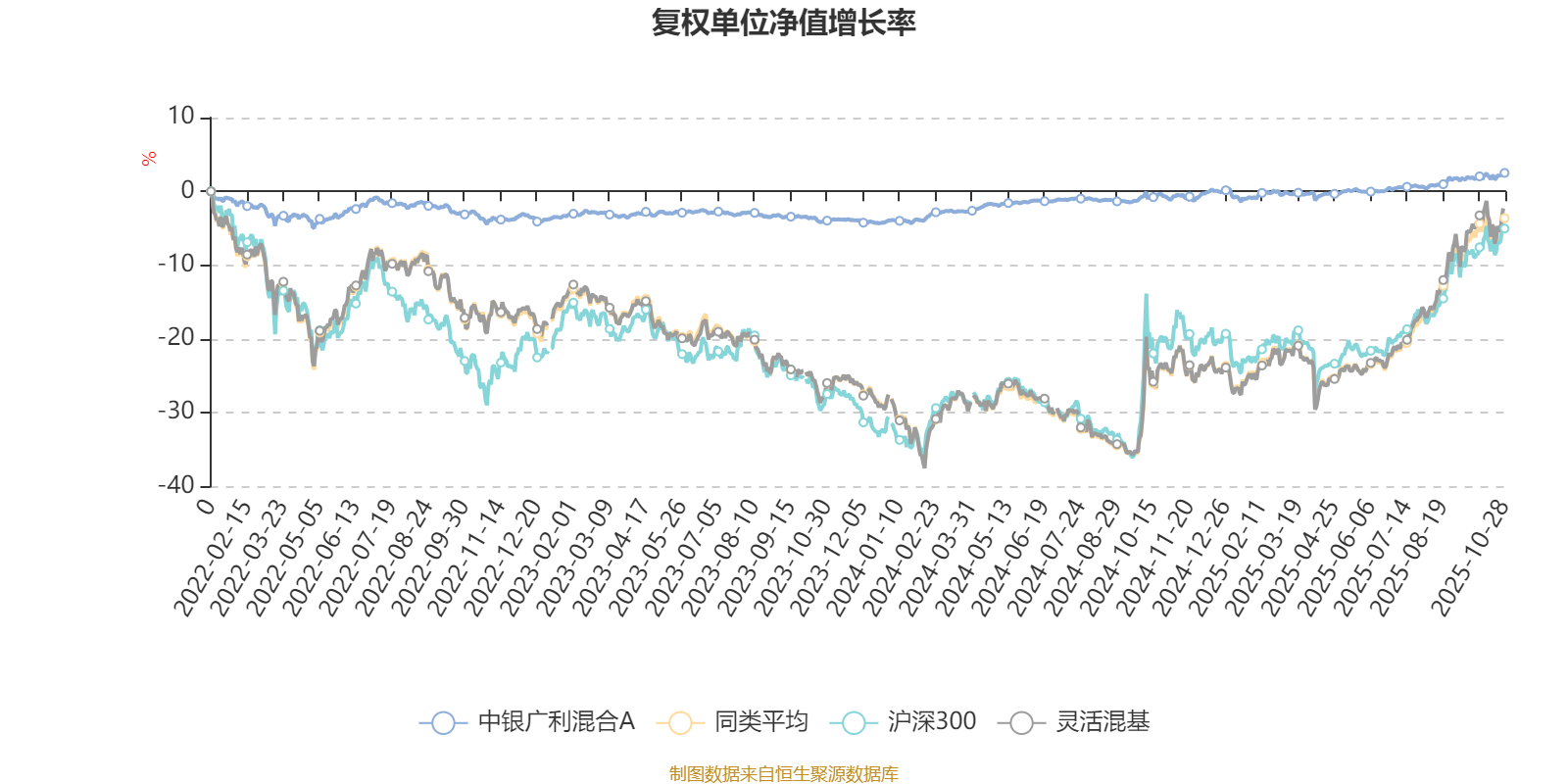 截至10月28日,中银广利混合A近三个月复权单位净值增长率为1.84%,位于同类可比基金1106/1287;近半年复权单位净值增长率为2.87%,位于同类可比基金1220/1287;近一年复权单位净值增长率为3.25%,位于同类可比基金1185/1287;近三年复权单位净值增长率为7.04%,位于同类可比基金863/1286。